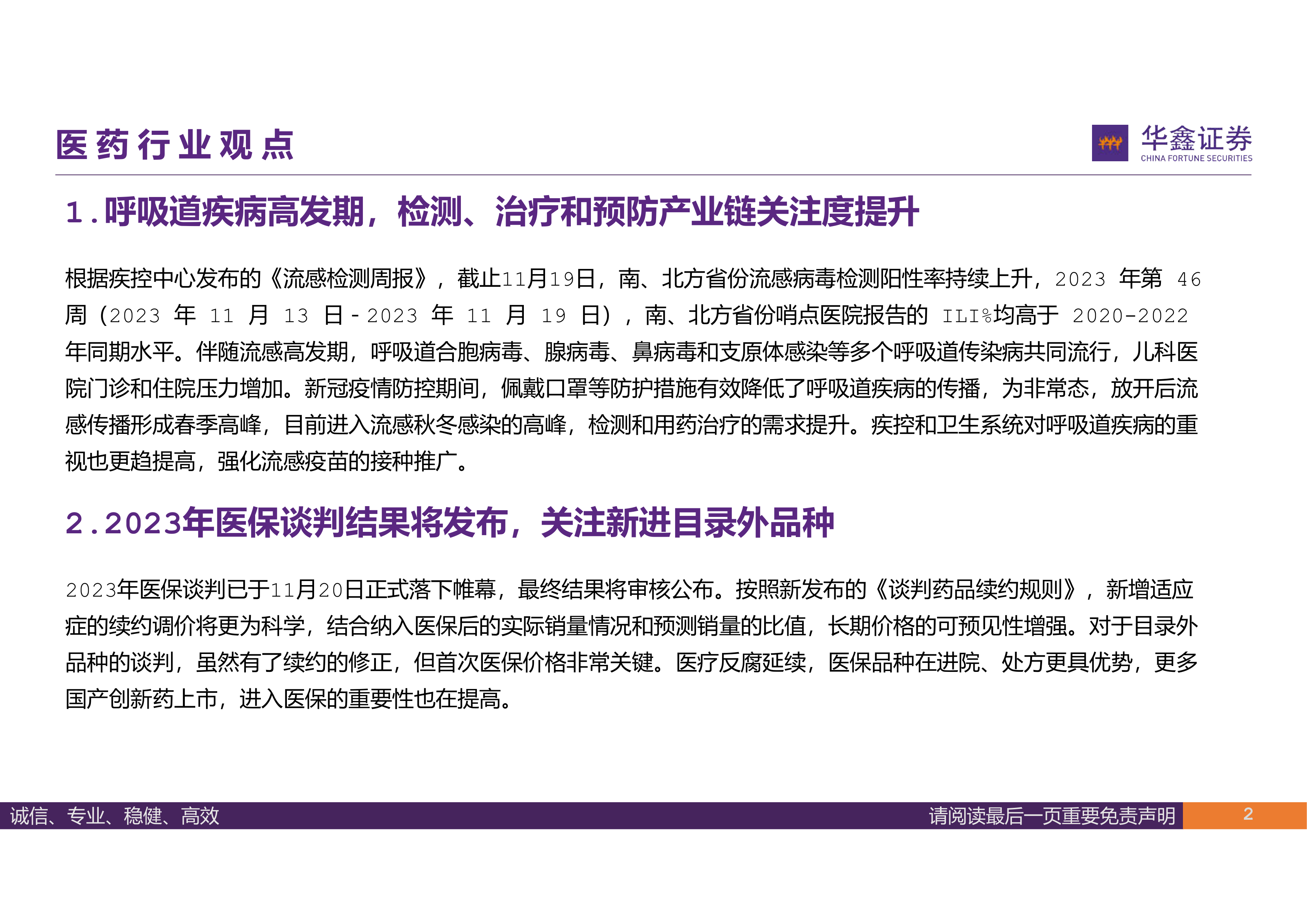 本报告的核心观点是:呼吸道疾病高发期叠加医保谈判结果公布、双通道政策推进以及创新药研发进展等因素,共同影响着医药行业的发展。报告建议关注呼吸道疾病检测治疗预防产业链、受益于医保政策调整的零售药店和相关品种、重磅创新药领域以及国采格局变化下的单品增量机会。