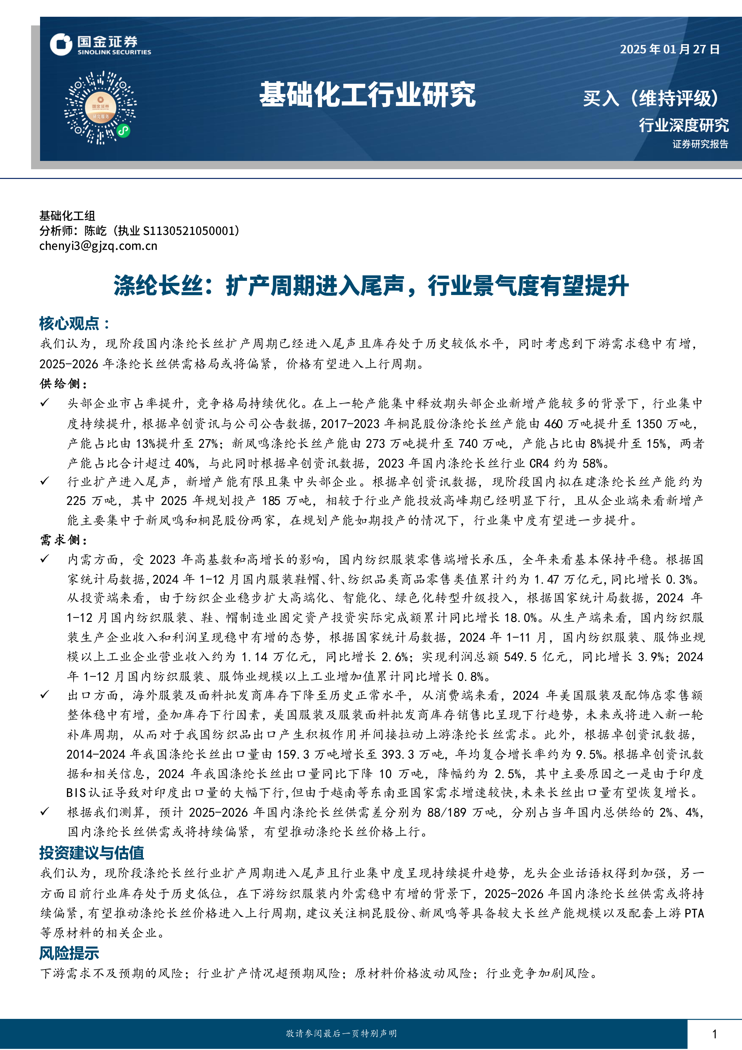 本报告基于对涤纶长丝行业供给侧和需求侧的深入分析,认为2025-2026年国内涤纶长丝市场供需格局将偏紧,价格有望上涨。 报告强调了行业集中度提升、头部企业话语权增强以及下游需求稳中有增等关键因素。 同时,报告也指出了潜在的风险因素,为投资者提供了全面的参考信息。 建议投资者在投资决策时,需综合考虑报告中的分析和预测,并结合自身风险承受能力进行判断。