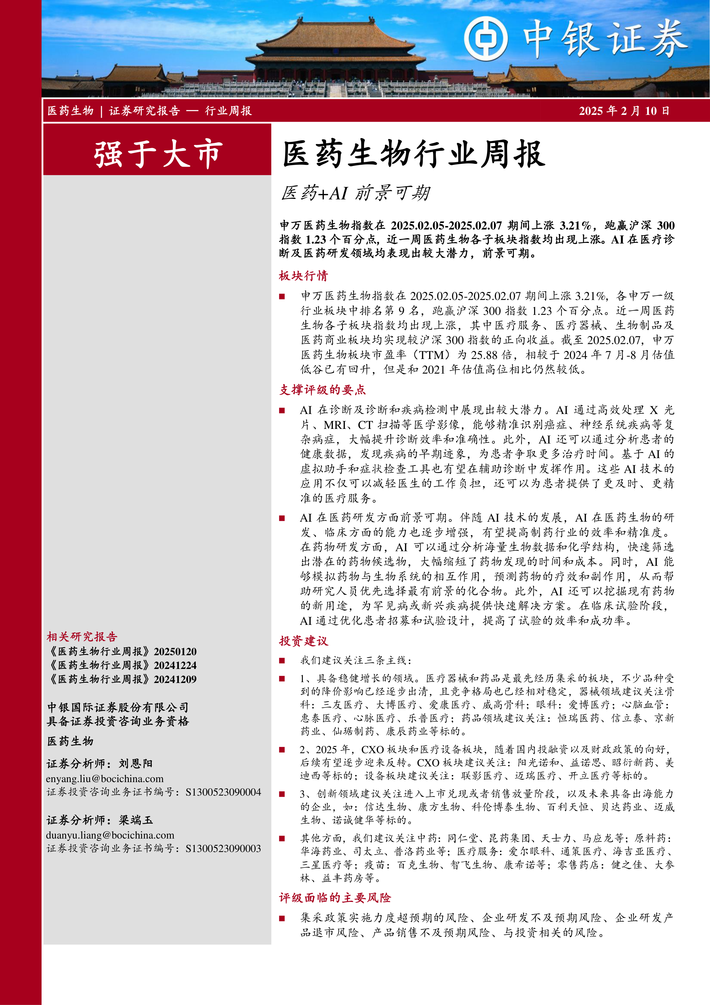申万医药生物指数在2025.02.05-2025.02.07期间上涨3.21%,跑赢沪深300指数1.23个百分点,近一周医药生物各子板块指数均出现上涨。AI在医疗诊断及医药研发领域均表现出较大潜力,前景可期。