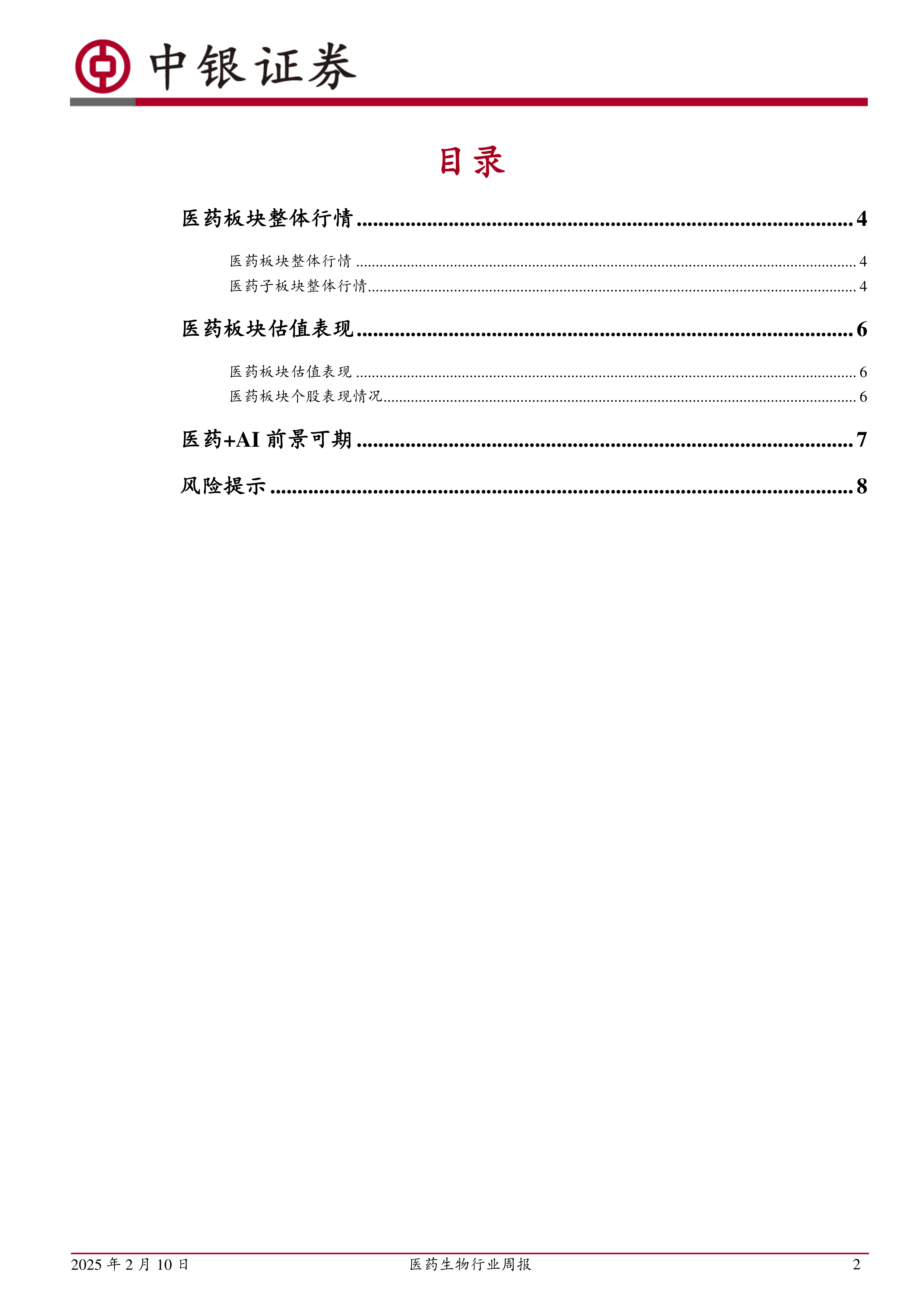 本报告主要内容包括医药板块整体行情、医药子板块整体行情、医药板块估值表现、医药板块个股表现情况以及医药+AI前景展望等几个方面。