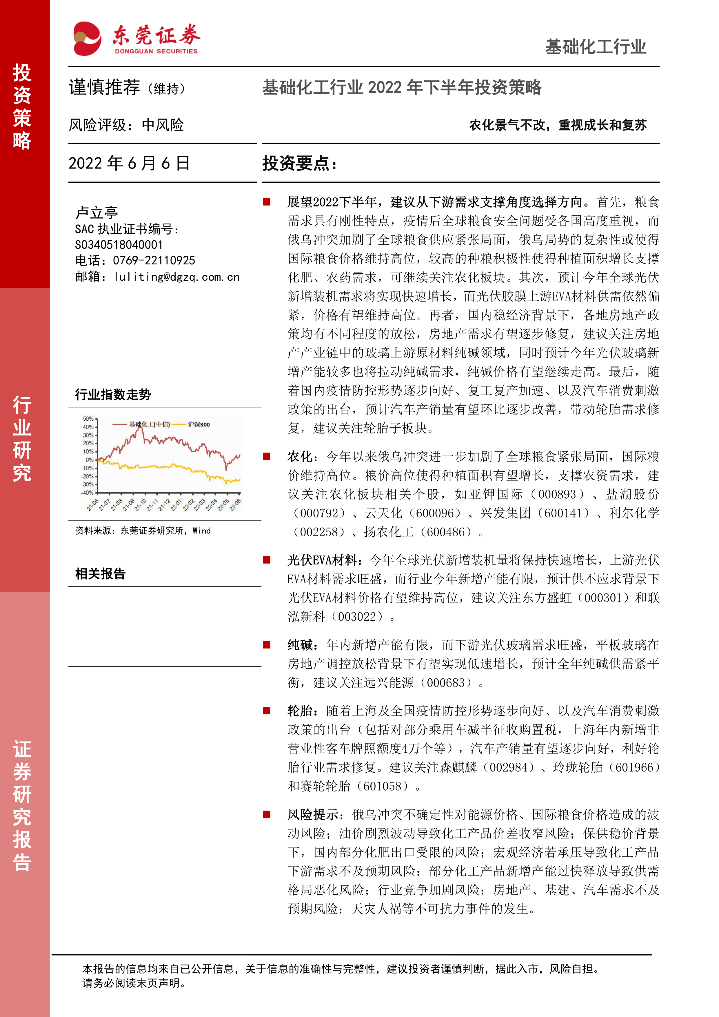 展望2022下半年,建议从下游需求支撑角度选择方向。首先,粮食需求具有刚性特点,疫情后全球粮食安全问题受各国高度重视,而俄乌冲突加剧了全球粮食供应紧张局面,俄乌局势的复杂性或使得国际粮食价格维持高位,较高的种粮积极性使得种植面积增长支撑化肥、农药需求,可继续关注农化板块。其次,预计今年全球光伏新增装机需求将实现快速增长,而光伏胶膜上游EVA材料供需依然偏紧,价格有望维持高位。再者,国内稳经济背景下,各地房地产政策均有不同程度的放松,房地产需求有望逐步修复,建议关注房地产产业链中的玻璃上游原材料纯碱领域,同时预计今年光伏玻璃新增产能较多也将拉动纯碱需求,纯碱价格有望继续走高。最后,随着国内疫情防控形势逐步向好、复工复产加速、以及汽车消费刺激政策的出台,预计汽车产销量有望环比逐步改善,带动轮胎需求修复,建议关注轮胎子板块。