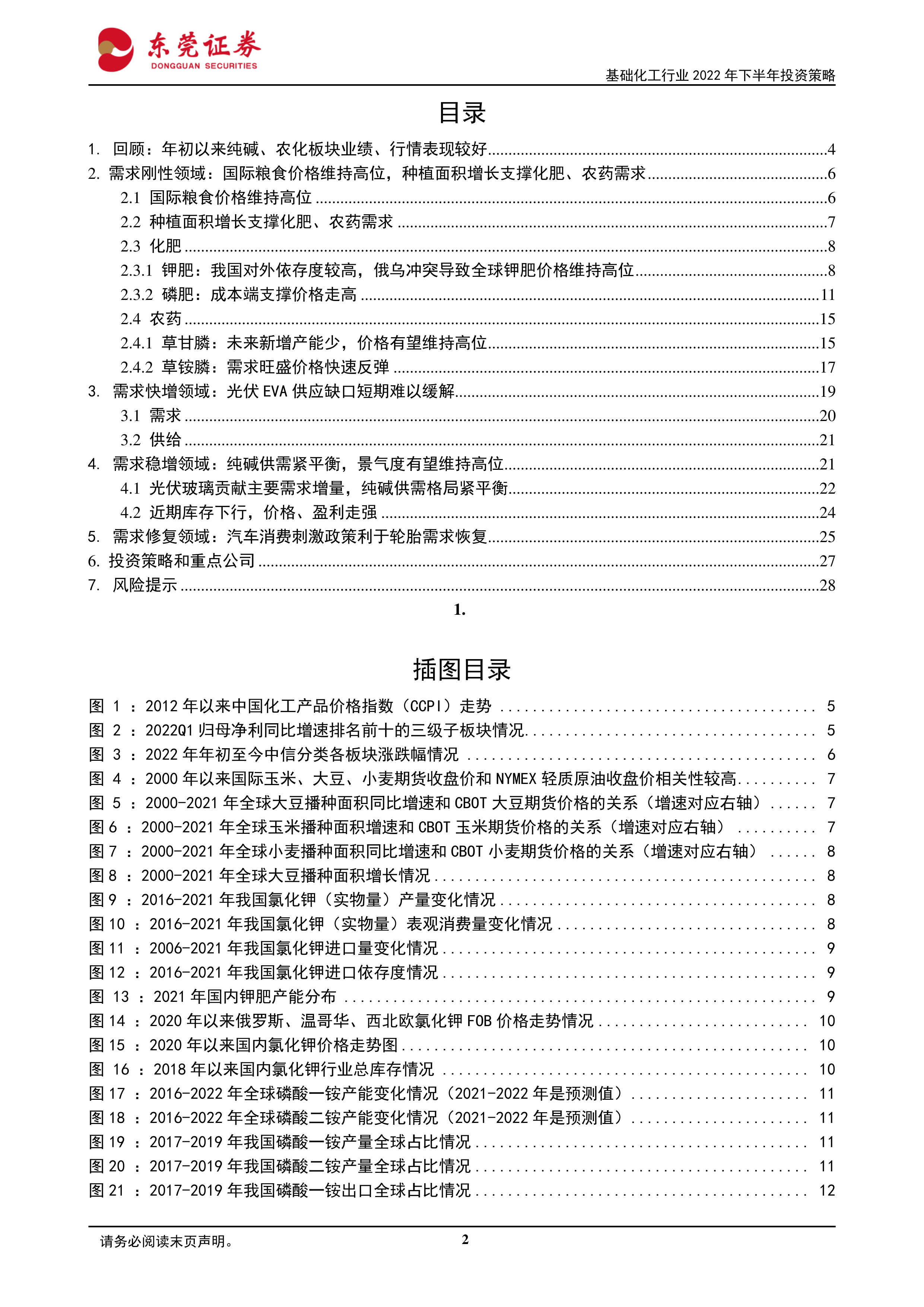 风险提示:俄乌冲突不确定性对能源价格、国际粮食价格造成的波动风险;油价剧烈波动导致化工产品价差收窄风险;保供稳价背景下,国内部分化肥出口受限的风险;宏观经济若承压导致化工产品下游需求不及预期风险;部分化工产品新增产能过快释放导致供需格局恶化风险;行业竞争加剧风险;房地产、基建、汽车需求不及预期风险;天灾人祸等不可抗力事件的发生。
