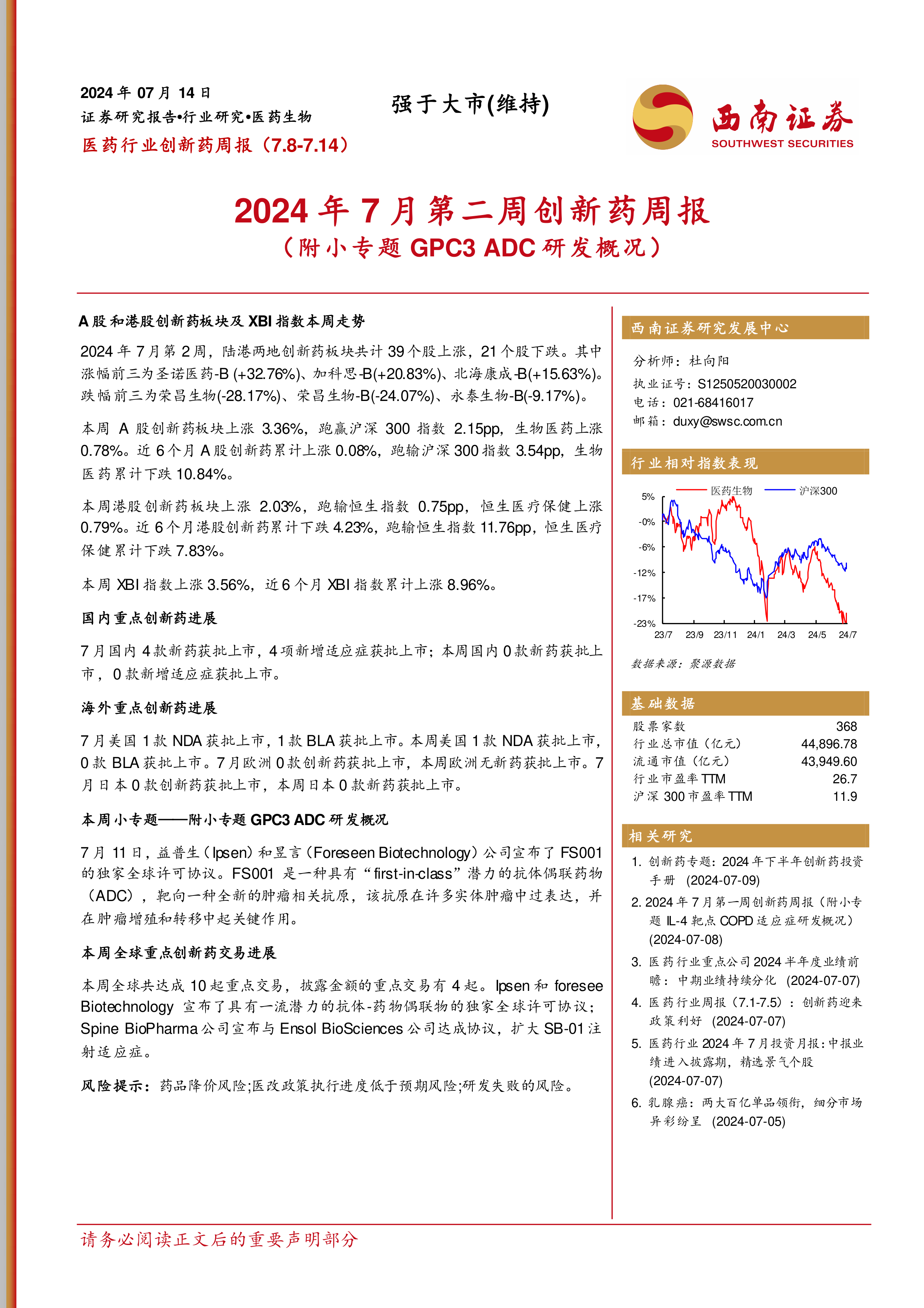 2024年7月第二周创新药周报(附小专题GPC3 ADC研发概况)