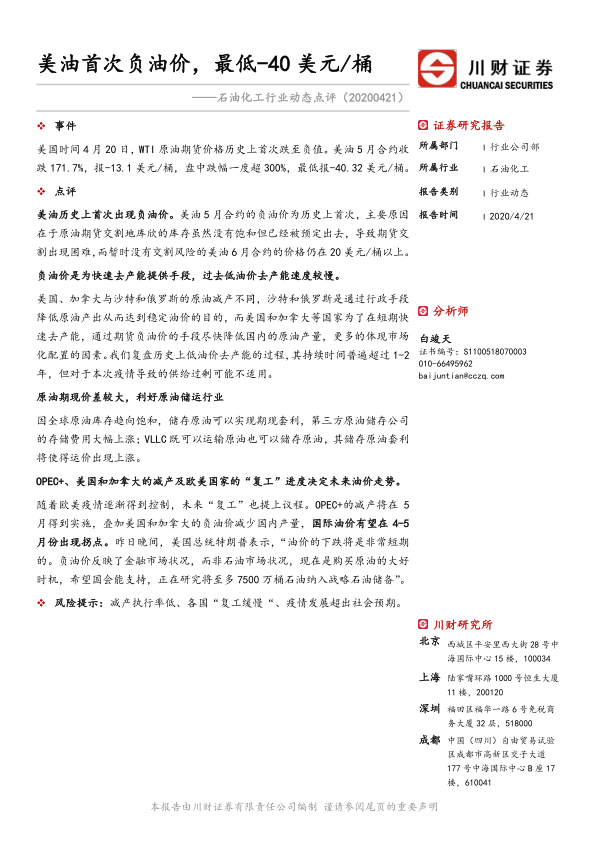 石油化工行业动态点评:美油首次负油价,最低-40美元/桶