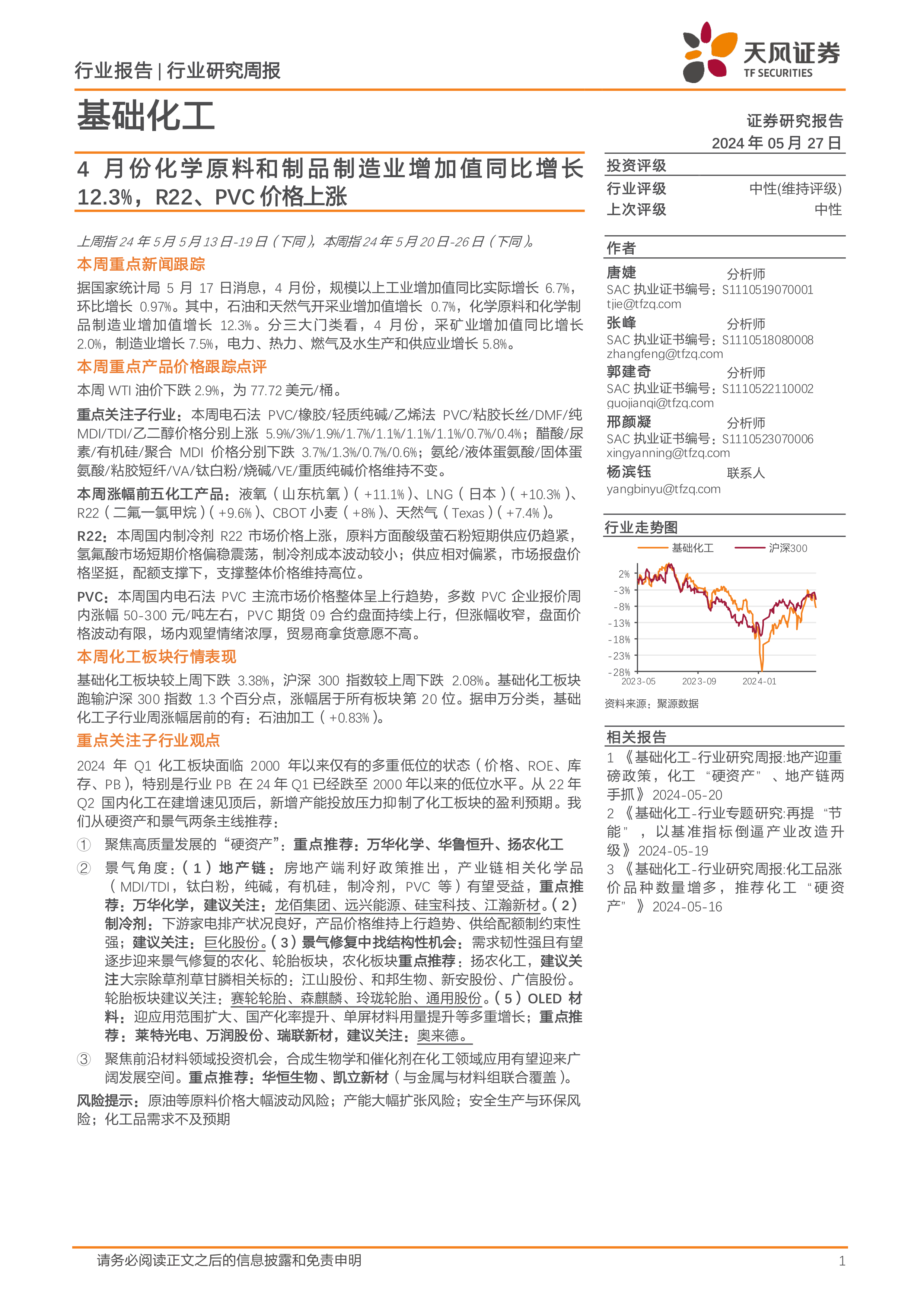 基础化工行业报告:4月份化学原料和制品制造业增加值同比增长12.3%,R22、PVC价格上涨