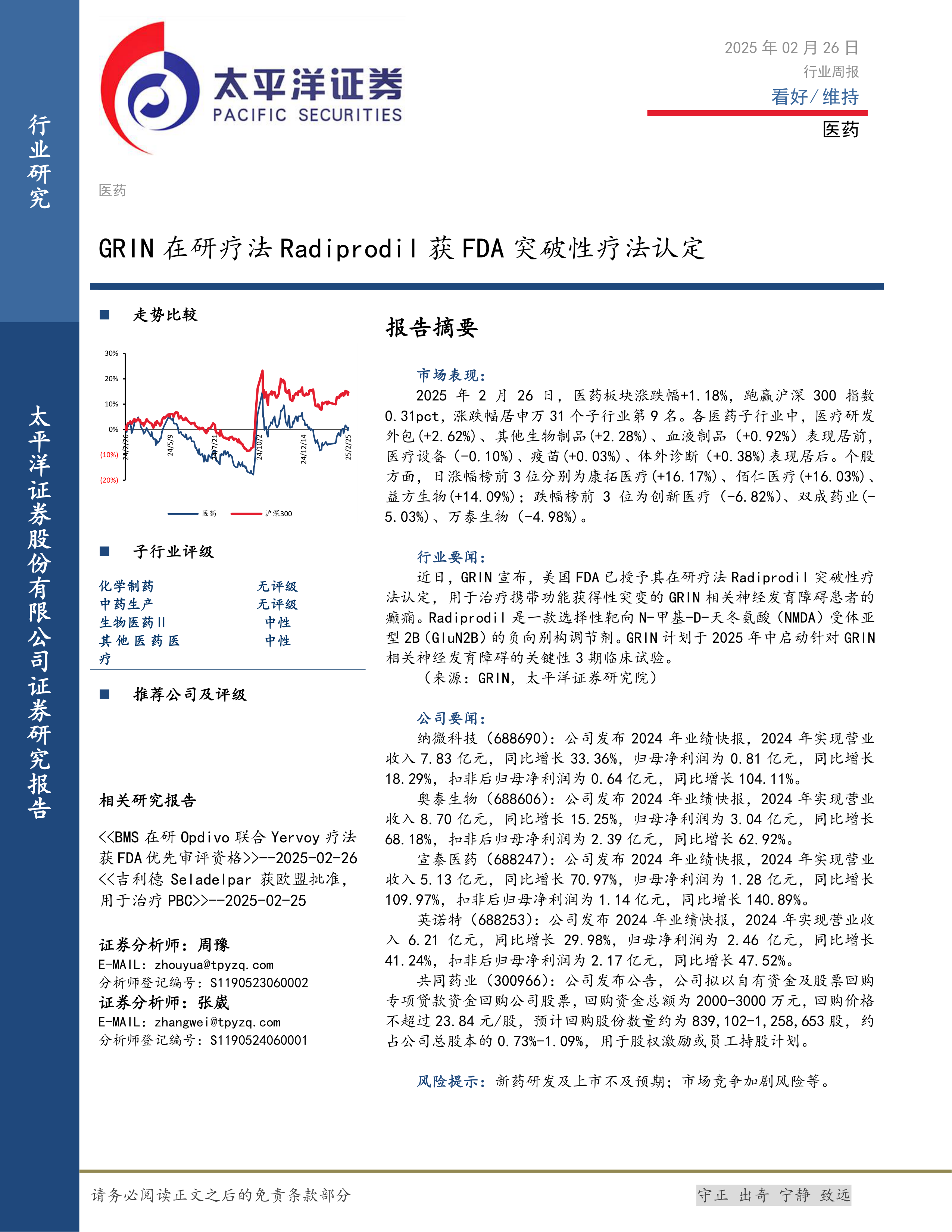本报告的核心观点是:医药板块整体表现良好,跑赢沪深300指数,部分子行业和个股表现突出。GRIN公司在研疗法Radiprodil获得FDA突破性疗法认定是本周医药行业的重要事件,对相关领域发展具有积极意义。同时,多家公司发布了2024年业绩快报,展现出良好的业绩增长。