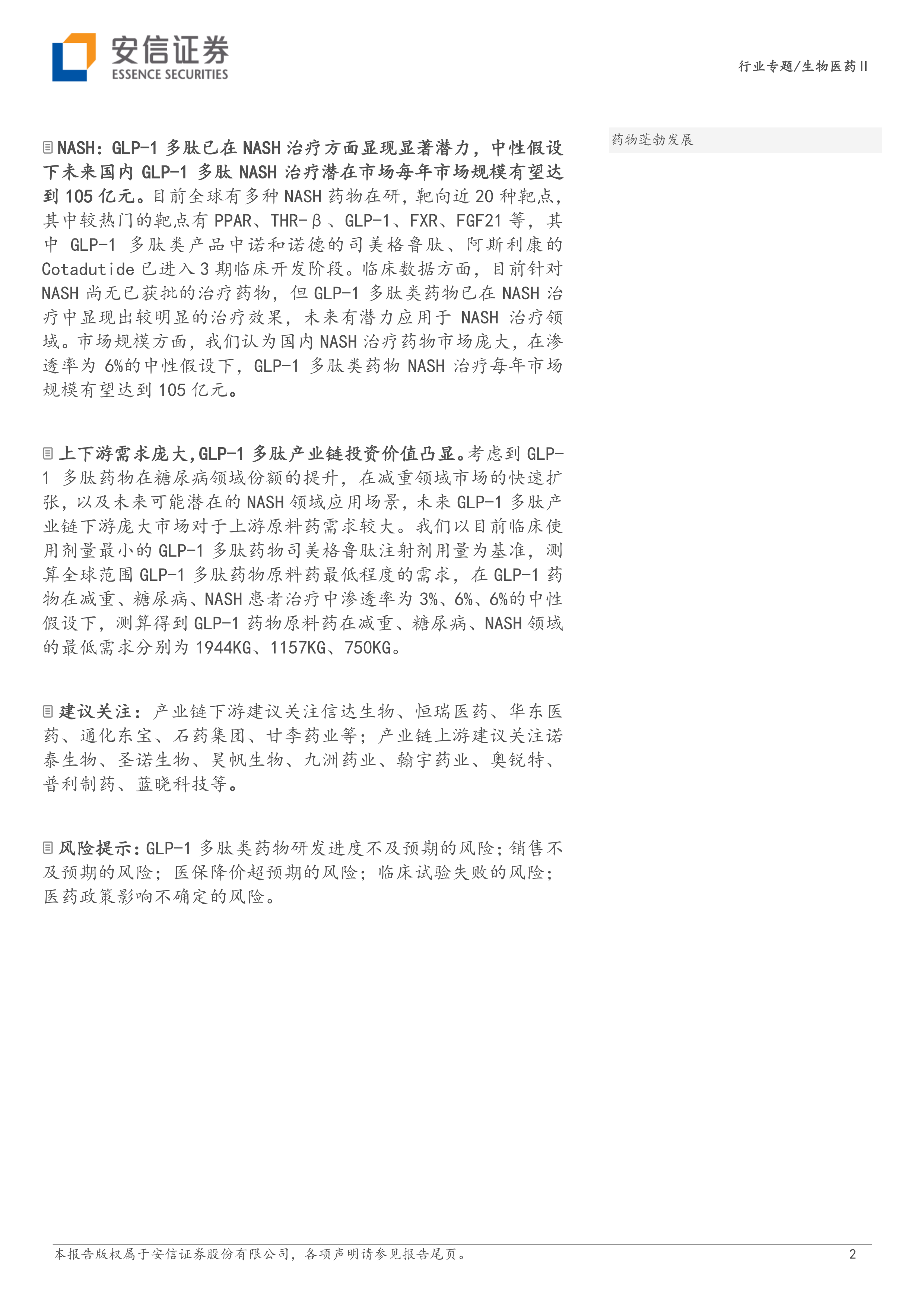 风险提示:GLP-1多肽类药物研发进度不及预期的风险;销售不及预期的风险;医保降价超预期的风险;临床试验失败的风险;医药政策影响不确定的风险。
