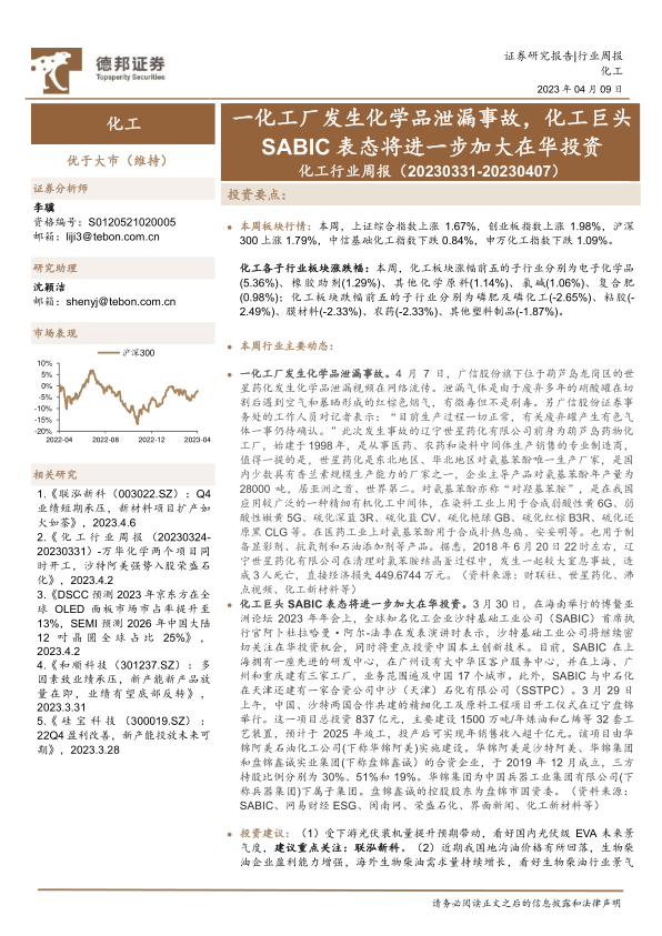 化工行业周报:一化工厂发生化学品泄漏事故,化工巨头SABIC表态将进一步加大在华投资