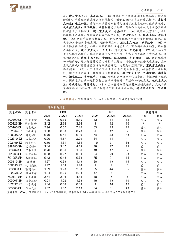 投资建议:(1)受下游光伏装机量提升预期带动,看好国内光伏级EVA未来景气度,建议重点关注:联泓新科。(2)近期我国地沟油价格有所回落,生物柴油企业盈利能力增强,海外生物柴油需求量持续增长,看好生物柴油行业景气度。建议重点关注:嘉澳环保。(3)硅基材料受新能源相关领域拉动,需求持续向好。受装配式建筑及光伏组件拉动,看好工业胶及建筑胶需求提升,建议重点关注:硅宝科技。看好未来多晶硅产能持续投放下三氯氢硅的行业高景气度,建议重点关注:三孚股份。硅基材料需求向好,龙头企业凭借低成本优势实现产能扩张与产业链衍生,建议重点关注:合盛硅业。(4)碳中和大背景下,看好能降低生产成本、碳排放的合成生物学企业,建议重点关注:凯赛生物、华恒生物。(5)铬化学品行业整合完成,行业格局优化下头部企业控价能力出色,铬化学品价格经历多轮上调,提振公司业绩,建议重点关注:振华股份。(6)磷化工供需格局改善,今年以来磷矿石价格持续上行,商品磷矿供应偏紧,磷矿资源属性凸显,建议重点关注:云天化、川恒股份、兴发集团。(7)碳中和大背景下环保要求提升,催化剂领域市场空间广阔,多家公司实现国产替代进程,成长确定性强,建议重点关注:中触媒、凯立新材、建龙微纳。(8)国内纯碱市场持续向好,远兴能源作为国内天然碱法龙头,将受益于行业景气度上行,且新发现天然碱矿有望重塑国内纯碱供应格局,远期成长空间广阔,建议重点关注:远兴能源。(9)化工行业龙头企业历经多年竞争和扩张,持续夯实成本护城河,核心竞争力显著,且当前估值相对偏低,建议重点关注:万华化学、华鲁恒升、扬农化工、华峰化学。(10)全球轮胎市场是万亿级赛道,疫情加速行业洗牌,国内龙头企业加速扩张抢占全球市场份额,有望保持快速发展,建议重点关注:玲珑轮胎、赛轮轮胎。(11)宝丰能源为国内煤制烯烃领先企业,低成本优势构筑高盈利护城河,碳中和背景下迎来新发展机遇,建议重点关注:宝丰能源。