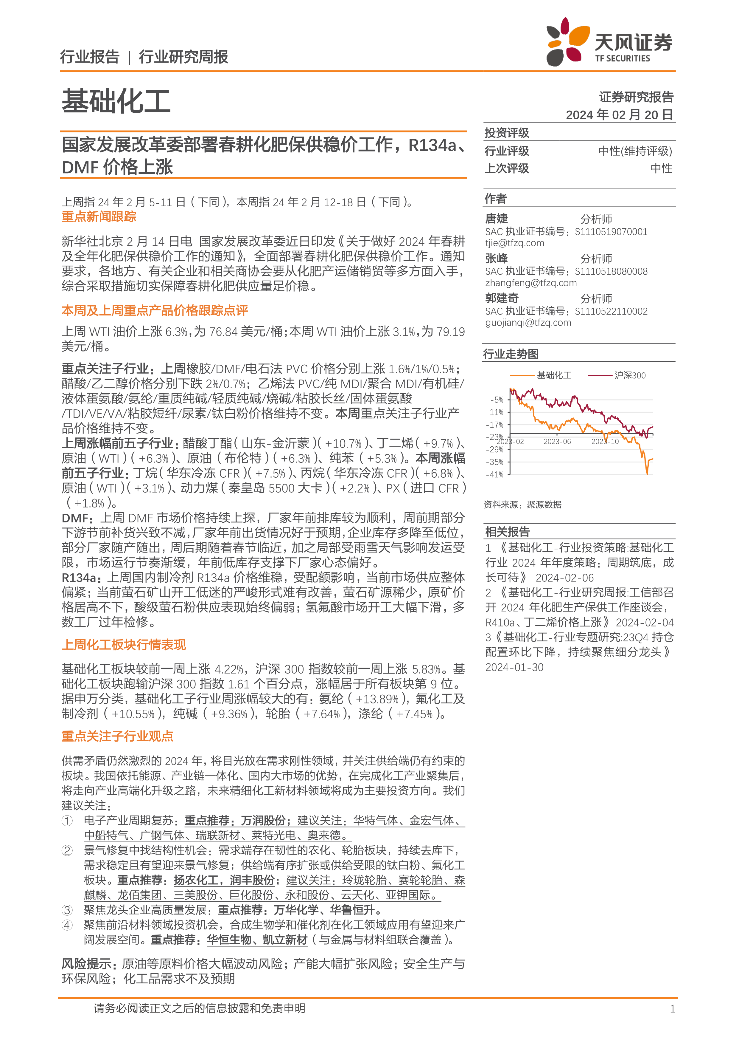 基础化工行业研究周报:国家发展改革委部署春耕化肥保供稳价工作,R134a、DMF价格上涨