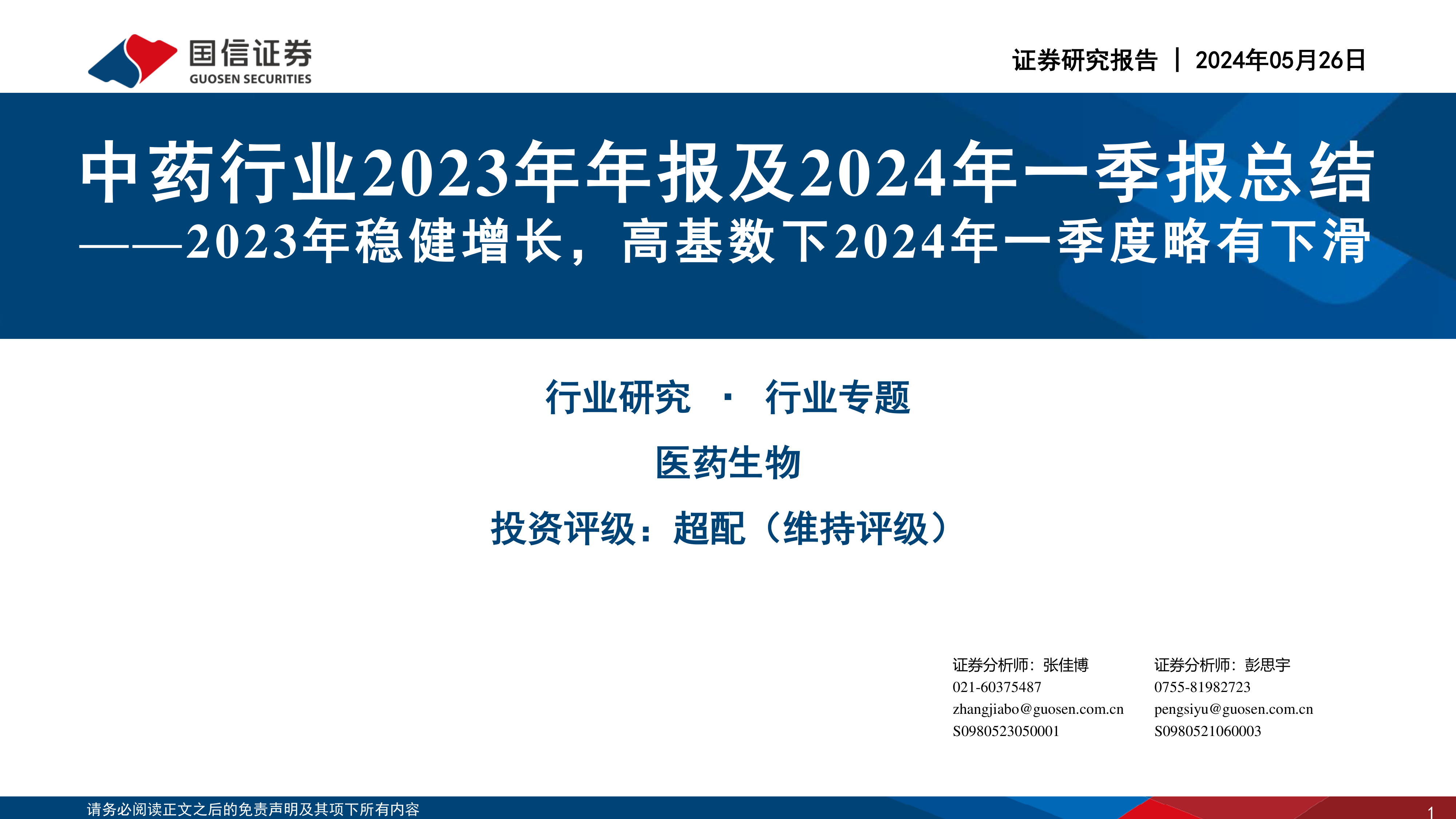 本报告基于2023年中药行业年报及2024年一季报数据,对中药行业市场现状、发展趋势及投资机会进行分析。报告核心观点如下:
