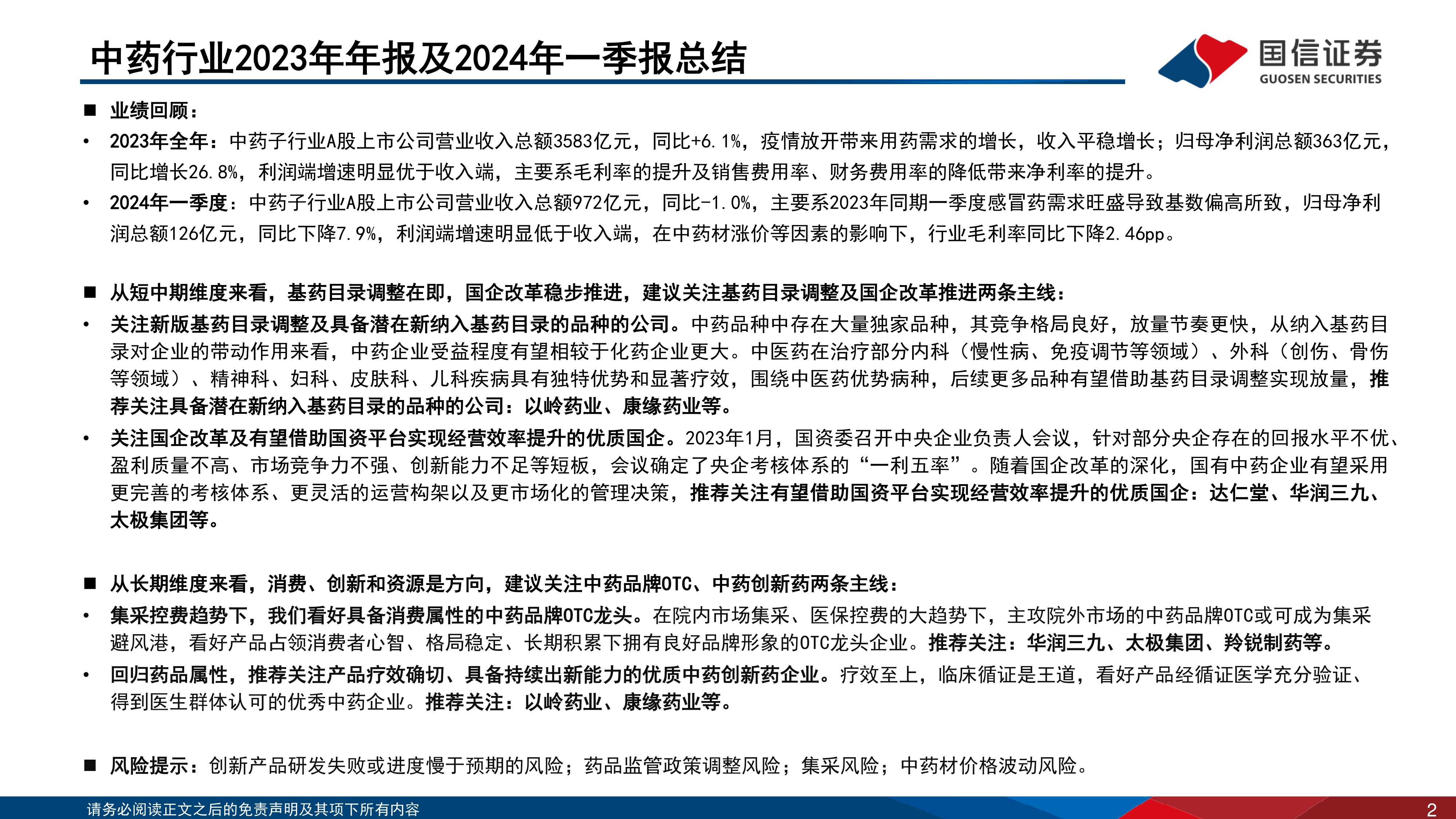 长期维度建议关注两条主线:一是具备消费属性的中药品牌OTC龙头企业,例如华润三九、太极集团、羚锐制药等;二是产品疗效确切、具备持续出新能力的优质中药创新药企业,例如以岭药业、康缘药业等。