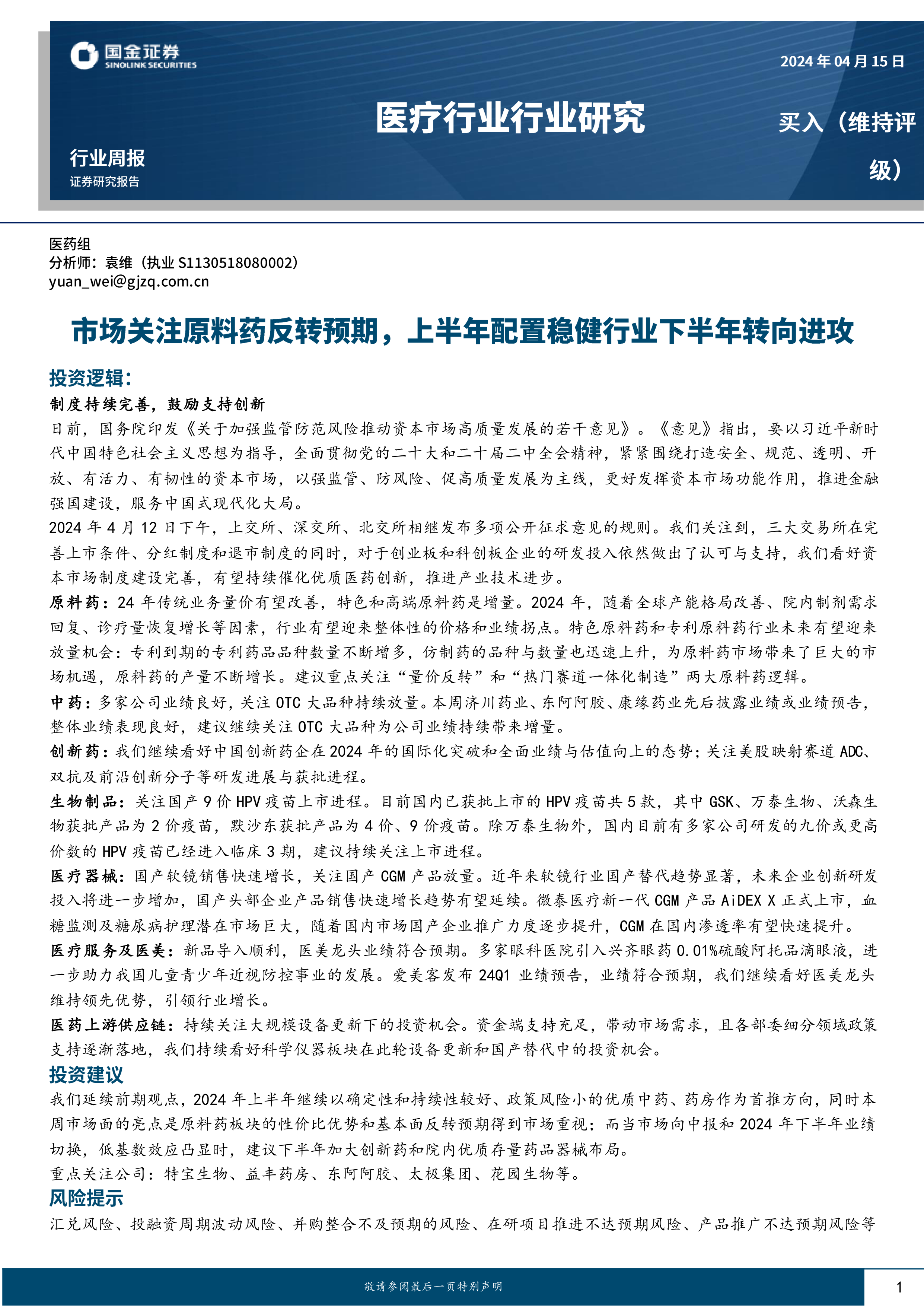 医疗行业行业研究:市场关注原料药反转预期,上半年配置稳健行业下半年转向进攻