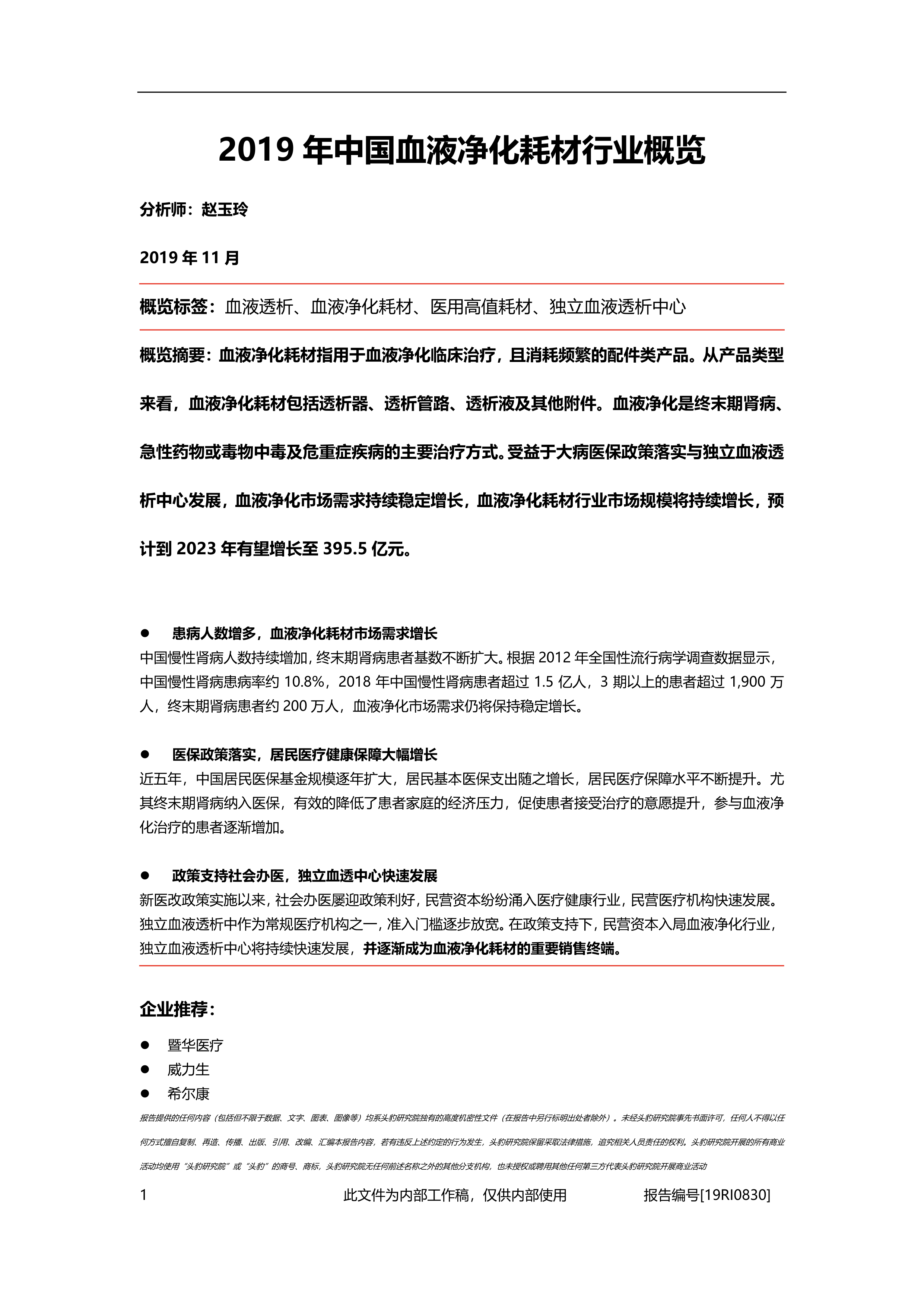 本报告对中国血液净化耗材行业进行了全面的市场分析,指出该行业市场规模持续增长,但同时也面临技术壁垒高、研发投入低等挑战。未来,进口替代将日益明显,行业集中度将不断提升,独立血透中心将快速发展。报告还推荐了三家具有发展潜力的企业,为投资者和行业参与者提供了有价值的参考信息。 报告数据主要基于2019年的公开信息,随着行业发展,数据可能会有所变化。