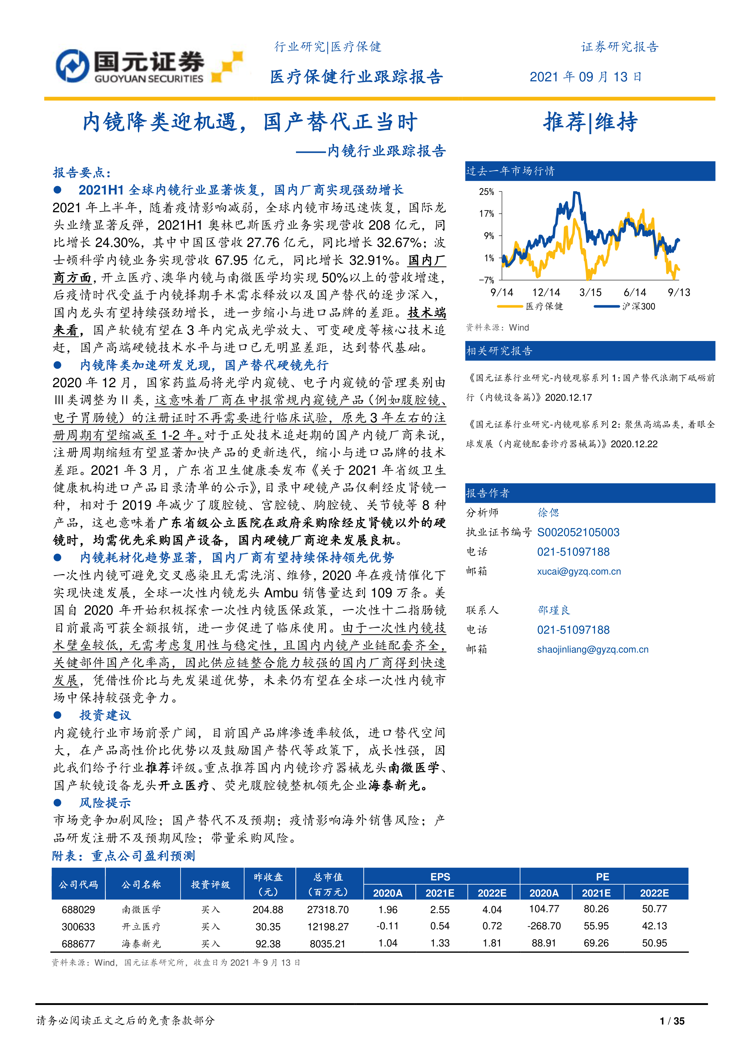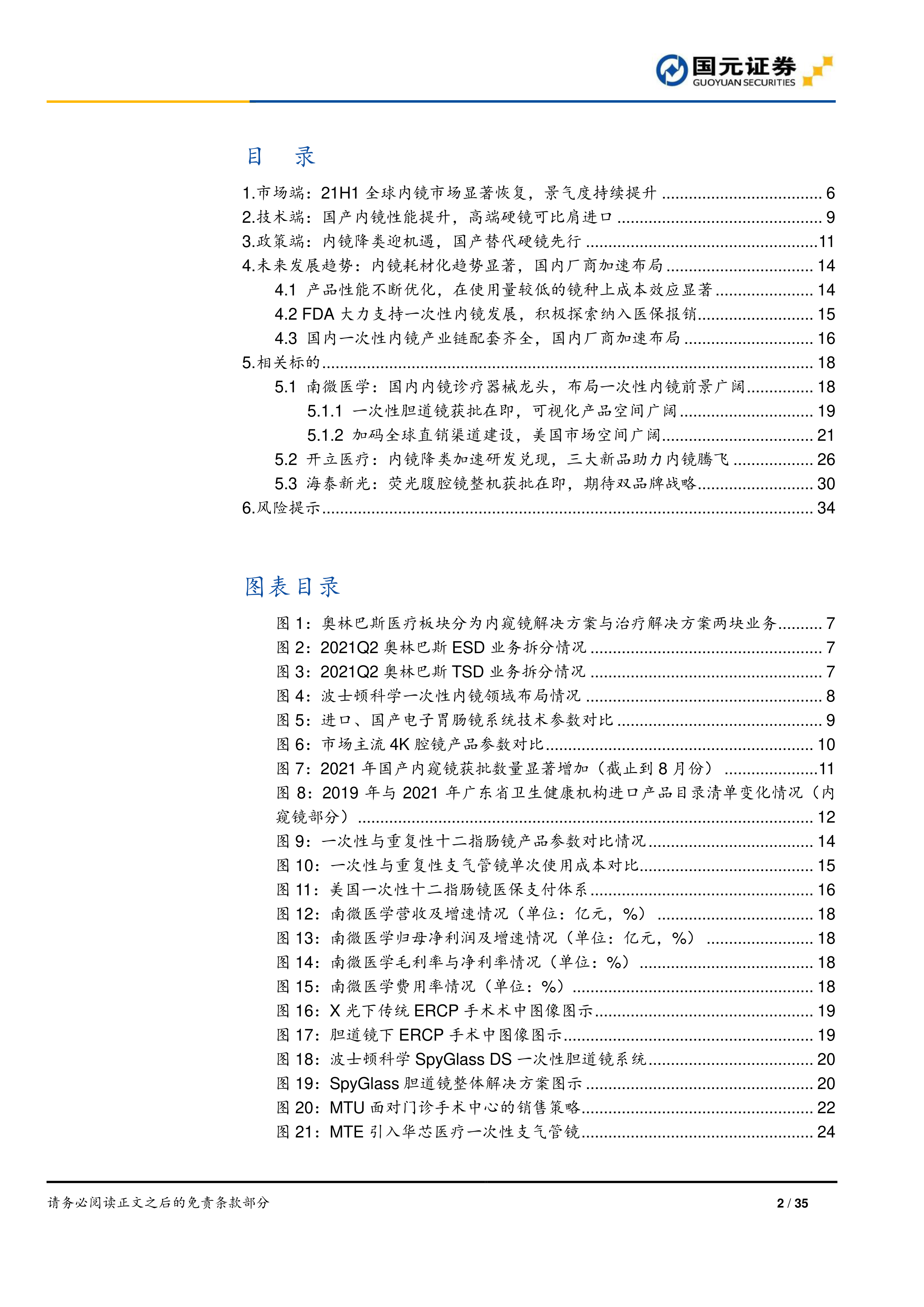 2021H1 全球内镜行业显著恢复,国内厂商实现强劲增长2021 年上半年, 随着疫情影响减弱, 全球内镜市场迅速恢复, 国际龙头业绩显著反弹,2021H1 奥林巴斯医疗业务实现营收 208 亿元,同比增长 24.30%,其中中国区营收 27.76 亿元,同比增长 32.67%;波士顿科学内镜业务实现营收 67.95 亿元,同比增长 32.91%。国内厂商方面,开立医疗、澳华内镜与南微医学均实现 50%以上的营收增速,后疫情时代受益于内镜择期手术需求释放以及国产替代的逐步深入,国内龙头有望持续强劲增长,进一步缩小与进口品牌的差距。技术端来看,国产软镜有望在 3 年内完成光学放大、可变硬度等核心技术追赶,国产高端硬镜技术水平与进口已无明显差距,达到替代基础。