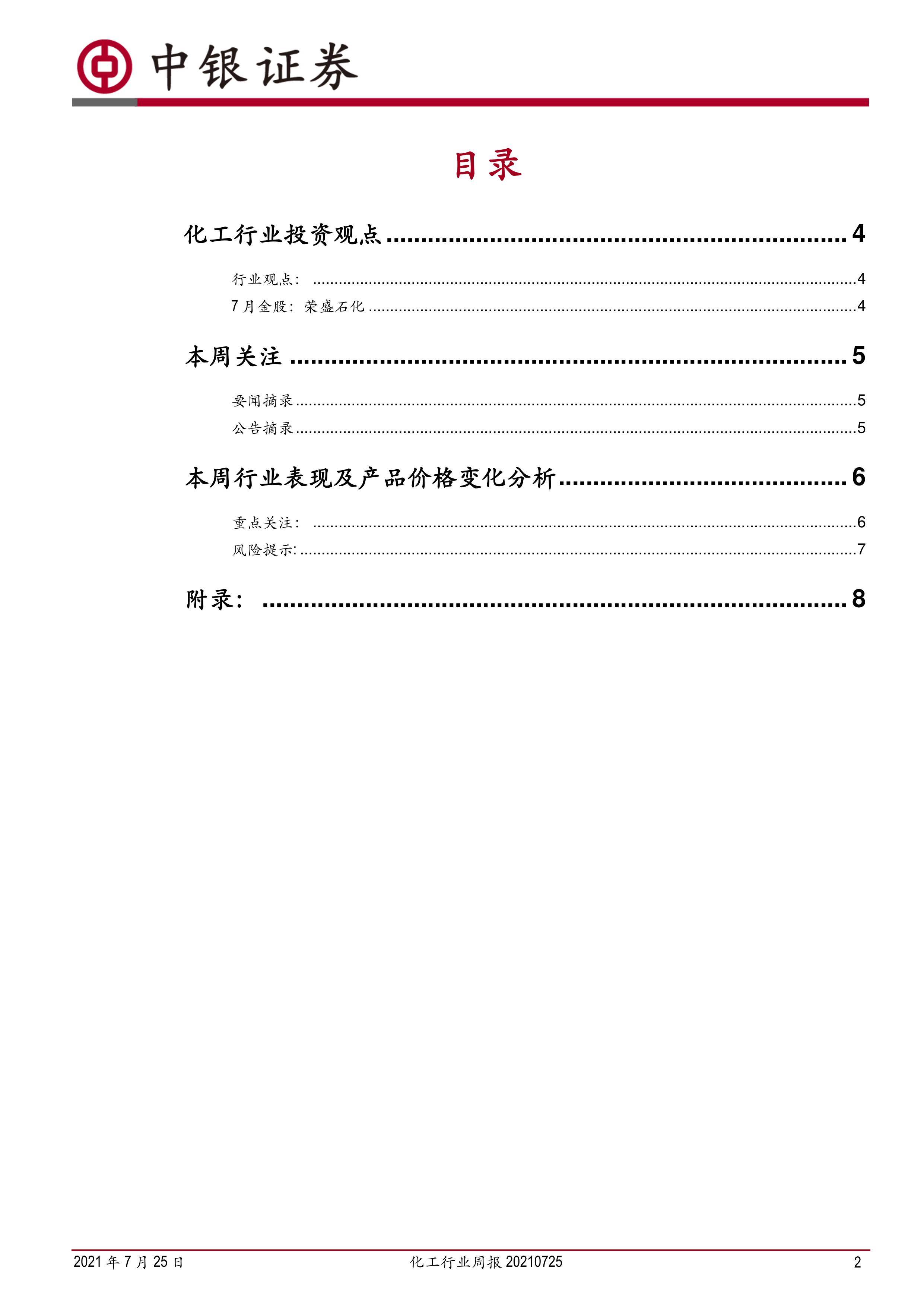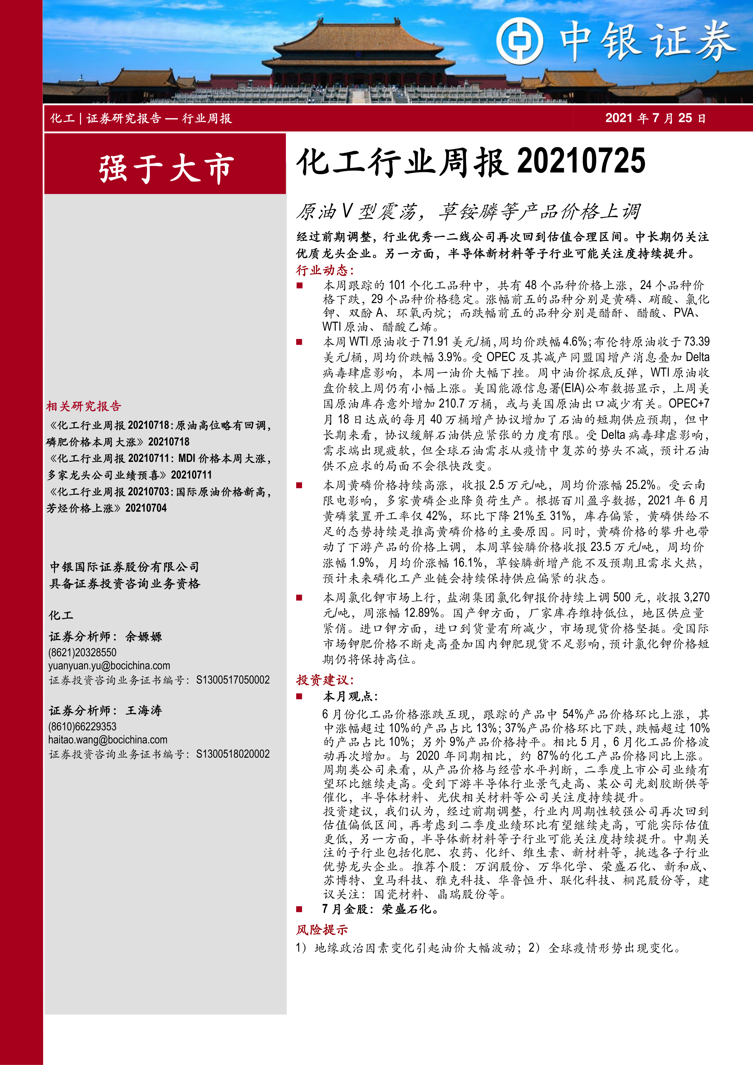 本报告对2021年7月25日一周的化工行业进行了全面分析,涵盖了行业整体表现、重点产品价格波动、子行业景气度变化以及投资建议等方面。报告指出,化工行业整体表现强于大市,部分产品价格上涨,主要受供给侧收缩和需求旺盛的驱动。经过前期调整,行业优秀一二线公司估值回归合理区间,中长期仍值得关注。半导体新材料等子行业关注度持续提升。报告还提供了具体的投资建议和风险提示,为投资者提供了有价值的参考信息。 报告数据主要来源于百川盈孚和万得数据库,并结合中银国际证券的分析师观点。 需要注意的是,报告中的投资建议仅供参考,投资者应根据自身情况进行独立判断。