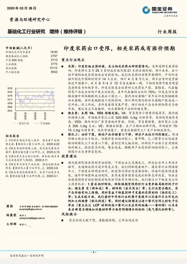 本报告分析了本周化工市场行情,重点关注了印度疫情对农药出口的影响、维生素产品价格上涨、煤化工行业运行情况以及国内经济复苏对下游需求的拉动作用。报告指出,印度封锁可能导致部分农药产品价格上涨,维生素产品持续走强,煤化工产品价格分化,国内经济复苏将利好下游需求。 报告最后列出了相关风险提示,并建议投资者关注农药、维生素、中间体等行业。 详细的市场数据和产品价格变化请参考报告中的图表数据。
