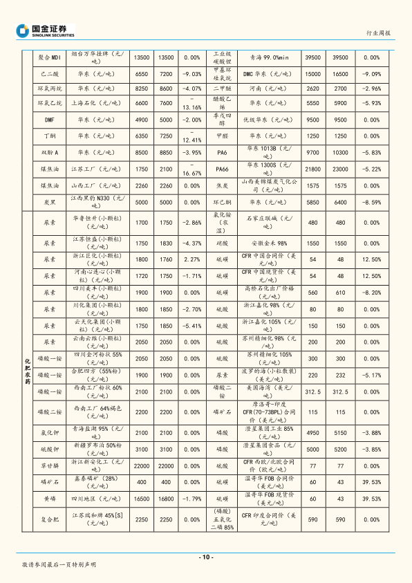 化肥行业: 春耕采购结束,市场需求转弱,供给压力提升,产品价格逐步下行。