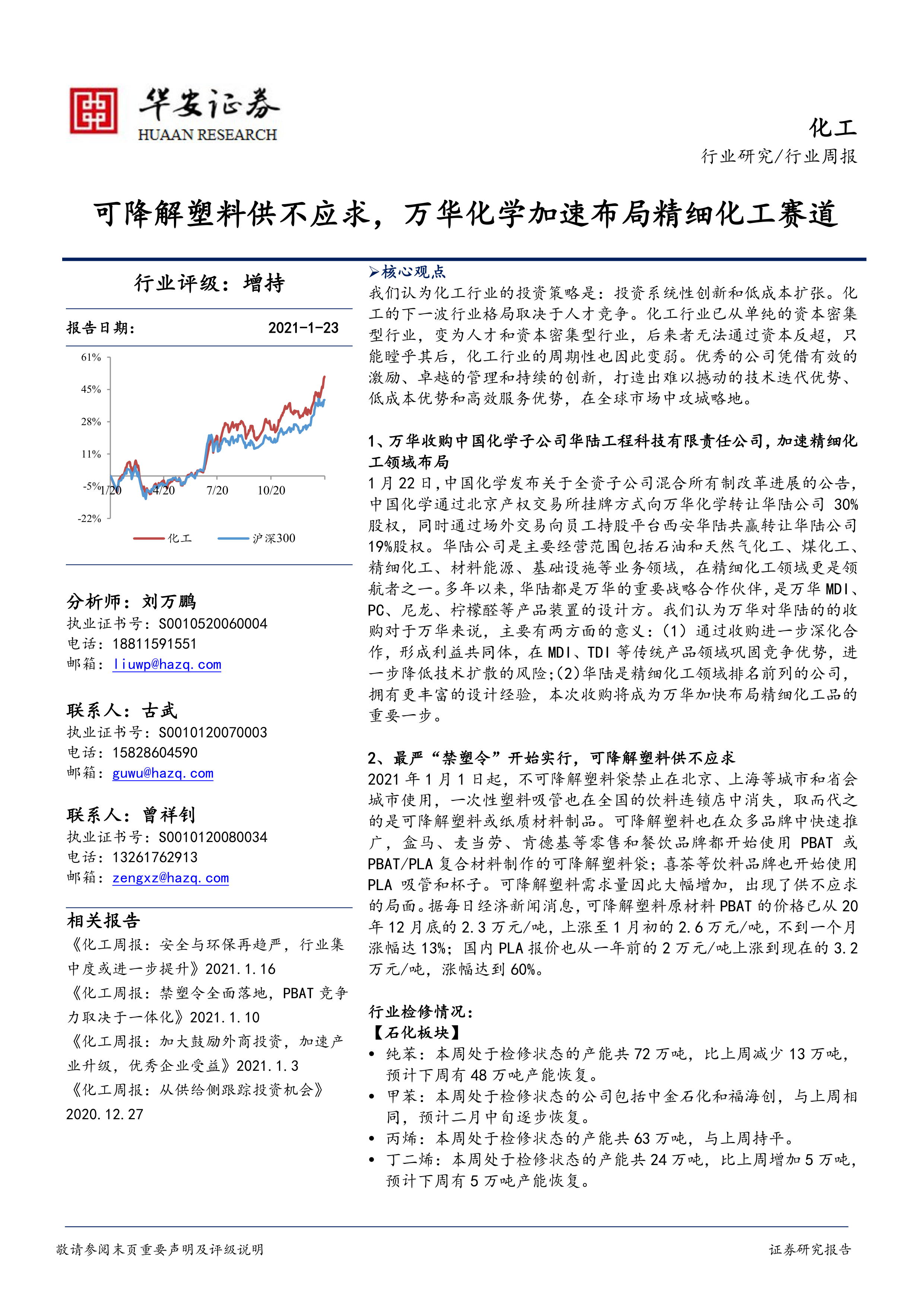 1月22日,中国化学发布关于全资子公司混合所有制改革进展的公告,中国化学通过北京产权交易所挂牌方式向万华化学转让华陆公司30%股权,同时通过场外交易向员工持股平台西安华陆共赢转让华陆公司19%股权。华陆公司是主要经营范围包括石油和天然气化工、煤化工、精细化工、材料能源、基础设施等业务领域,在精细化工领域更是领航者之一。多年以来,华陆都是万华的重要战略合作伙伴,是万华MDI、PC、尼龙、柠檬醛等产品装置的设计方。我们认为万华对华陆的的收购对于万华来说,主要有两方面的意义:(1)通过收购进一步深化合作,形成利益共同体,在MDI、TDI等传统产品领域巩固竞争优势,进一步降低技术扩散的风险;(2)华陆是精细化工领域排名前列的公司,拥有更丰富的设计经验,本次收购将成为万华加快布局精细化工品的重要一步。