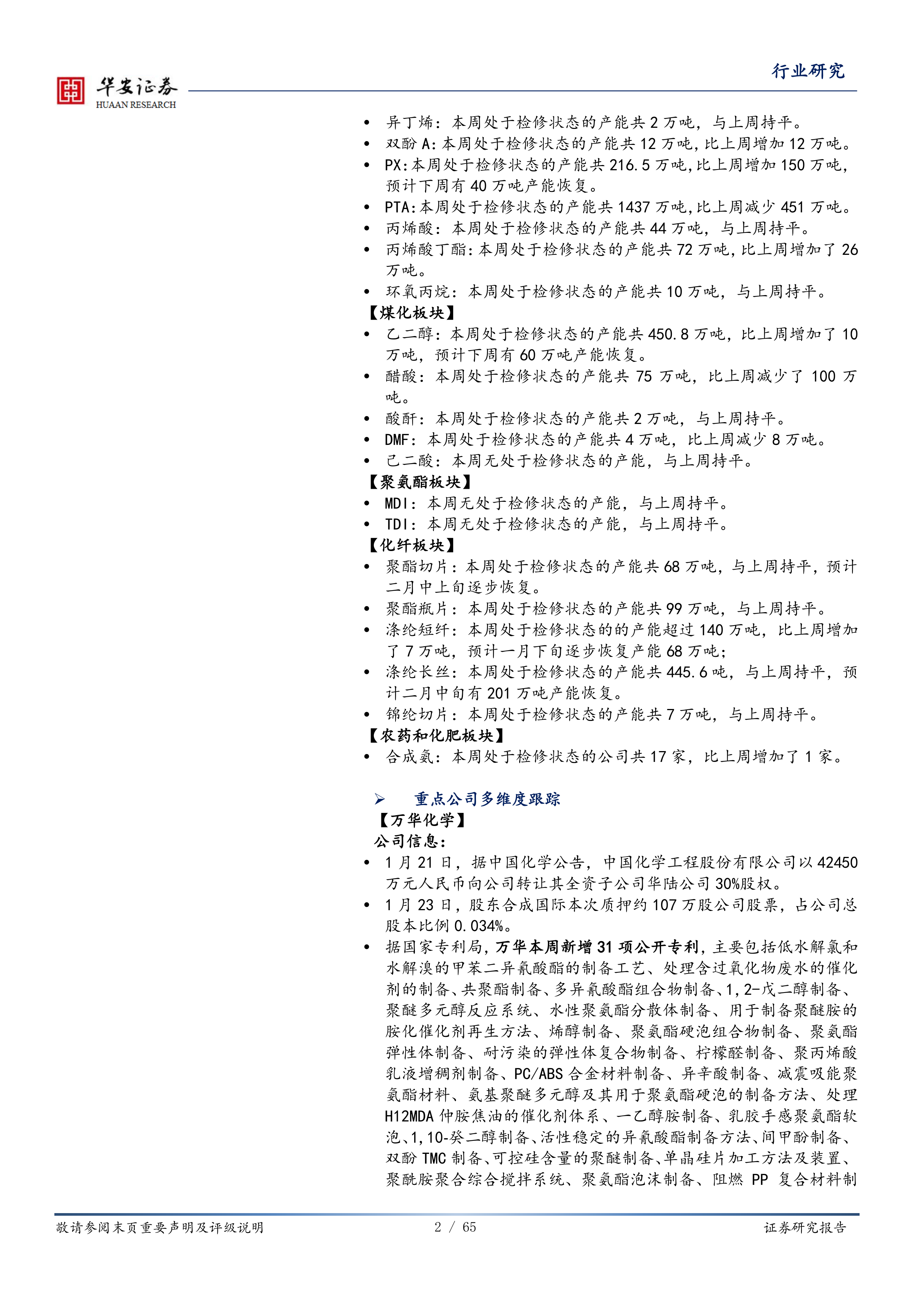 报告对万华化学、巴斯夫、科思创等国内外重点化工企业进行了多维度跟踪,内容涵盖公司新闻、专利信息、项目进展、市场表现等方面。