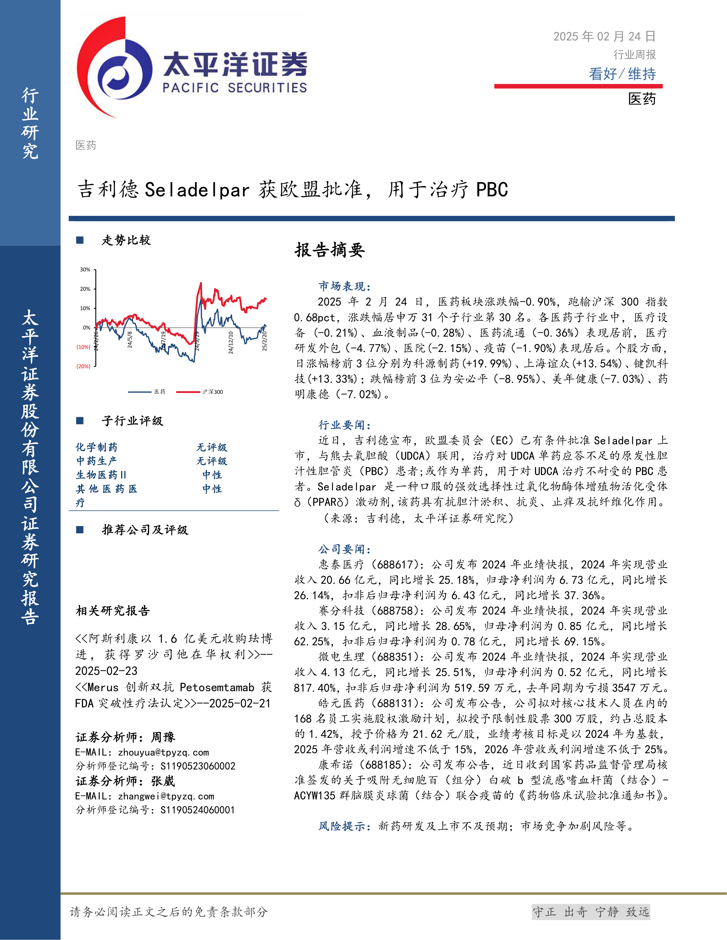 本报告的核心观点是:2025年2月24日,医药板块整体表现弱于大盘,但个股表现分化明显。吉利德Seladelpar获欧盟批准,为PBC治疗带来新选择,是医药行业的重要利好消息。部分公司业绩快报显示增长强劲,但整体行业面临新药研发及上市不及预期、市场竞争加剧等风险。