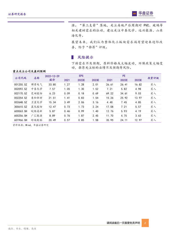 展望未来,我们认为整体化工板块需求端有望迎来边际改善,给予“推荐”评级。