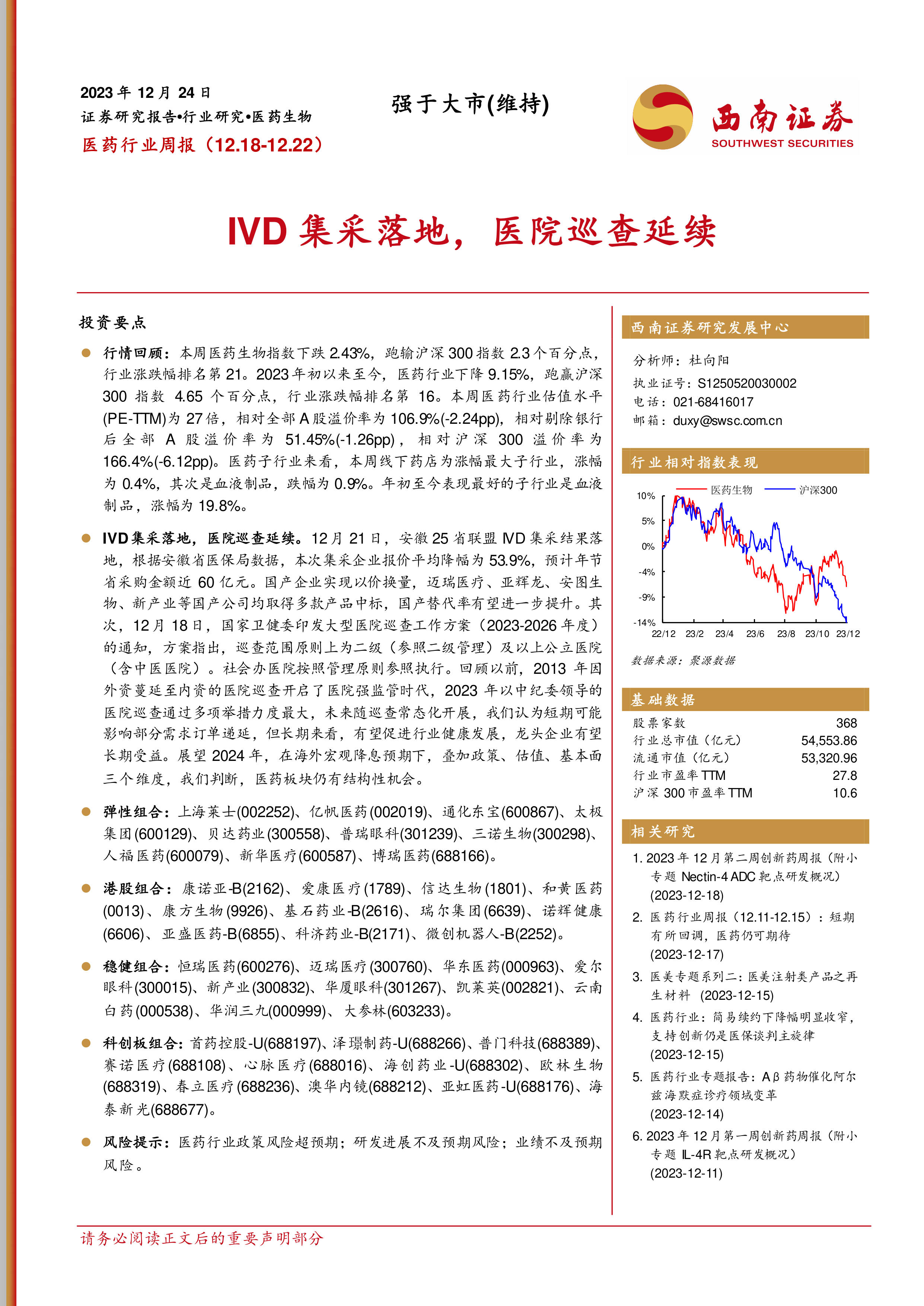 IVD集采落地,医院巡查延续。 12月 21日,安徽 25 省联盟 IVD 集采结果落地,根据安徽省医保局数据,本次集采企业报价平均降幅为 53.9%,预计年节省采购金额近 60 亿元。国产企业实现以价换量,迈瑞医疗、亚辉龙、安图生物、新产业等国产公司均取得多款产品中标,国产替代率有望进一步提升。其次, 12月 18日,国家卫健委印发大型医院巡查工作方案(2023-2026 年度)的通知,方案指出,巡查范围原则上为二级(参照二级管理)及以上公立医院(含中医医院)。社会办医院按照管理原则参照执行。回顾以前, 2013 年因外资蔓延至内资的医院巡查开启了医院强监管时代, 2023 年以中纪委领导的医院巡查通过多项举措力度最大,未来随巡查常态化开展,我们认为短期可能影响部分需求订单递延,但长期来看,有望促进行业健康发展,龙头企业有望长期受益。展望 2024 年,在海外宏观降息预期下,叠加政策、估值、基本面三个维度,我们判断,医药板块仍有结构性机会。