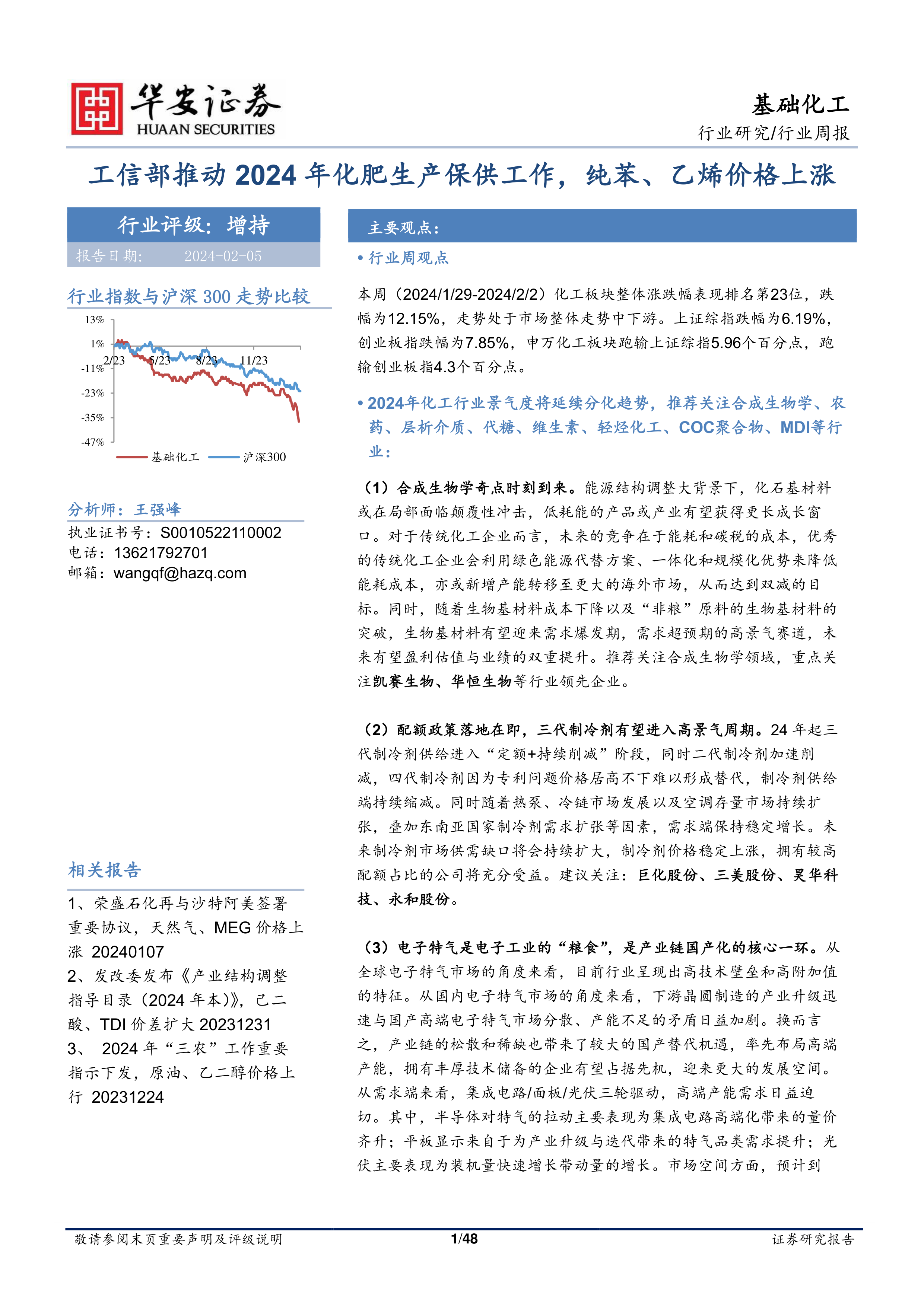 基础化工行业周报:工信部推动2024年化肥生产保供工作,纯苯、乙烯价格上涨