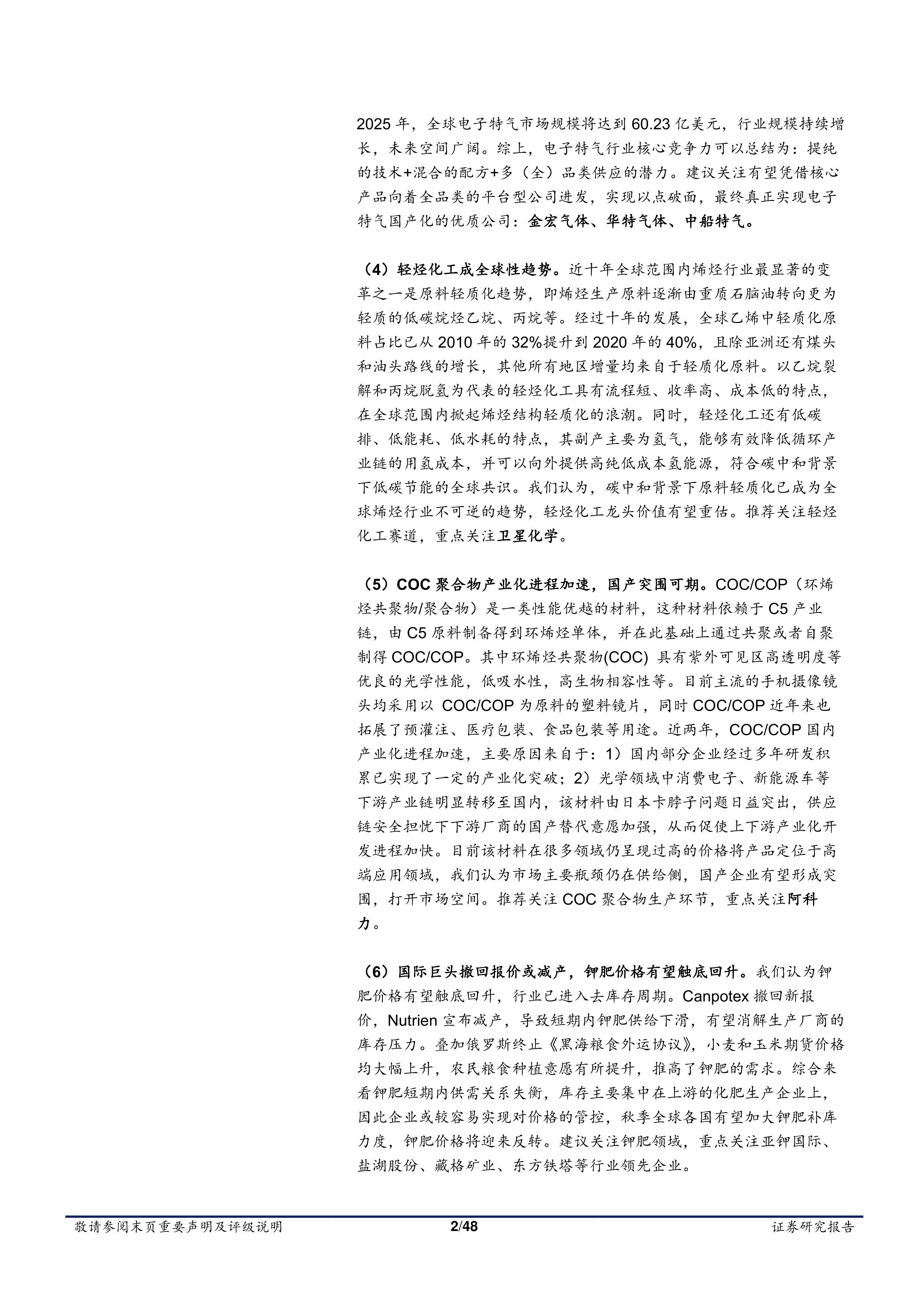 报告推荐关注合成生物学、农药、层析介质、代糖、维生素、轻烃化工、COC聚合物、MDI等高景气赛道,并针对具体公司给出投资建议,例如凯赛生物、华恒生物(合成生物学);巨化股份、三美股份、昊华科技、永和股份(制冷剂);金宏气体、华特气体、中船特气(电子特气);卫星化学(轻烃化工);阿科力(COC聚合物);亚钾国际、盐湖股份、藏格矿业、东方铁塔(钾肥);万华化学(MDI)。