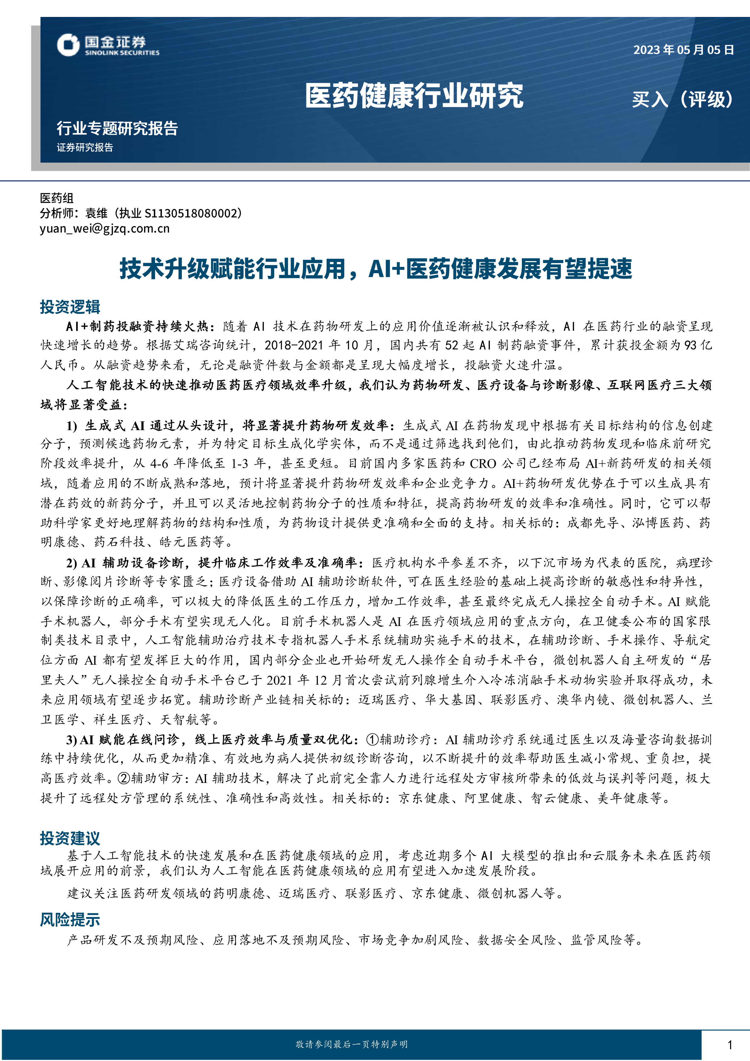 医药健康行业研究:技术升级赋能行业应用,AI+医药健康发展有望提速