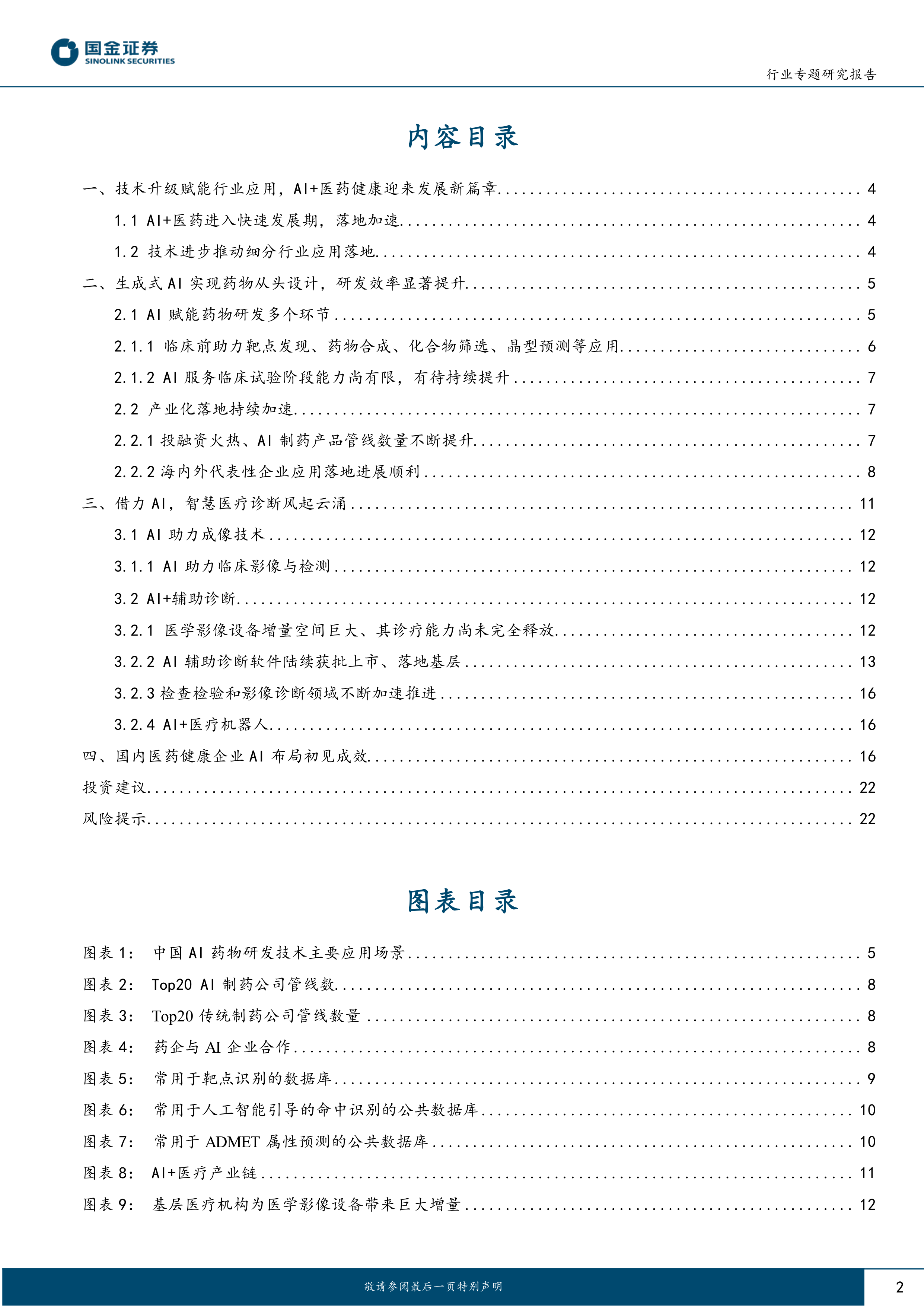 本报告的核心观点是:AI+制药投融资持续火热,人工智能技术正在加速赋能医药健康领域,药物研发、医疗设备与诊断影像、互联网医疗三大领域将显著受益。 AI在药物研发效率提升、医疗诊断准确率提高和在线问诊效率优化方面展现出巨大潜力,但同时也面临产品研发不及预期、应用落地不及预期、市场竞争加剧、数据安全和监管等风险。
