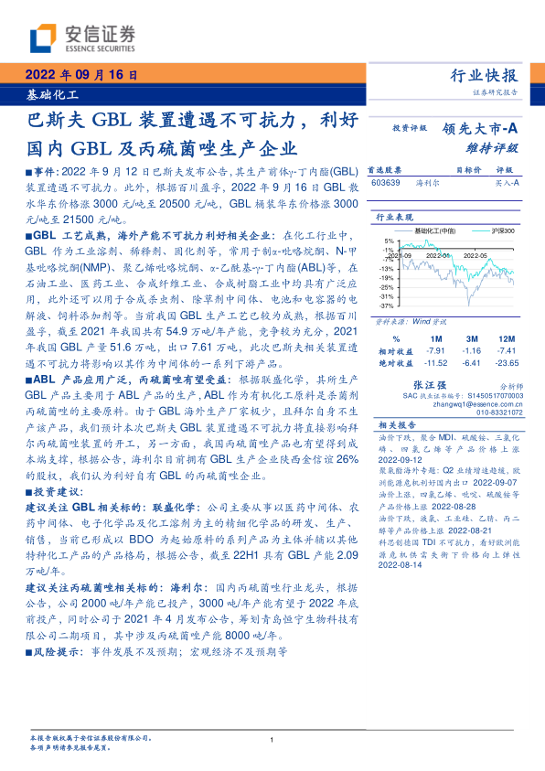 GBL产品主要用于ABL产品的生产,ABL作为有机化工原料是杀菌剂丙硫菌唑的主要原料。由于GBL海外生产厂家极少,且拜尔自身不生产该产品,我们预计本次巴斯夫GBL装置遭遇不可抗力将直接影响拜尔丙硫菌唑装置的开工,另一方面,我国丙硫菌唑产品也有望得到成本端支撑,根据公告,海利尔目前拥有GBL生产企业陕西金信谊26%的股权,我们认为利好自有GBL的丙硫菌唑企业。