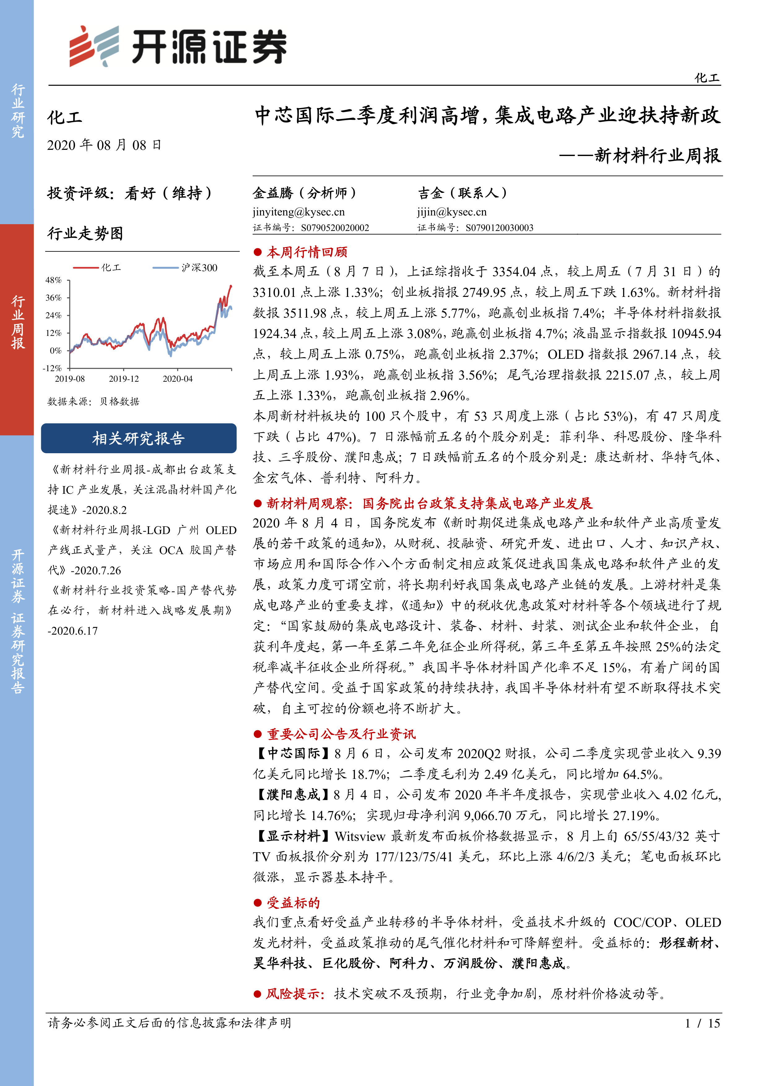 新材料行业周报:中芯国际二季度利润高增,集成电路产业迎扶持新政