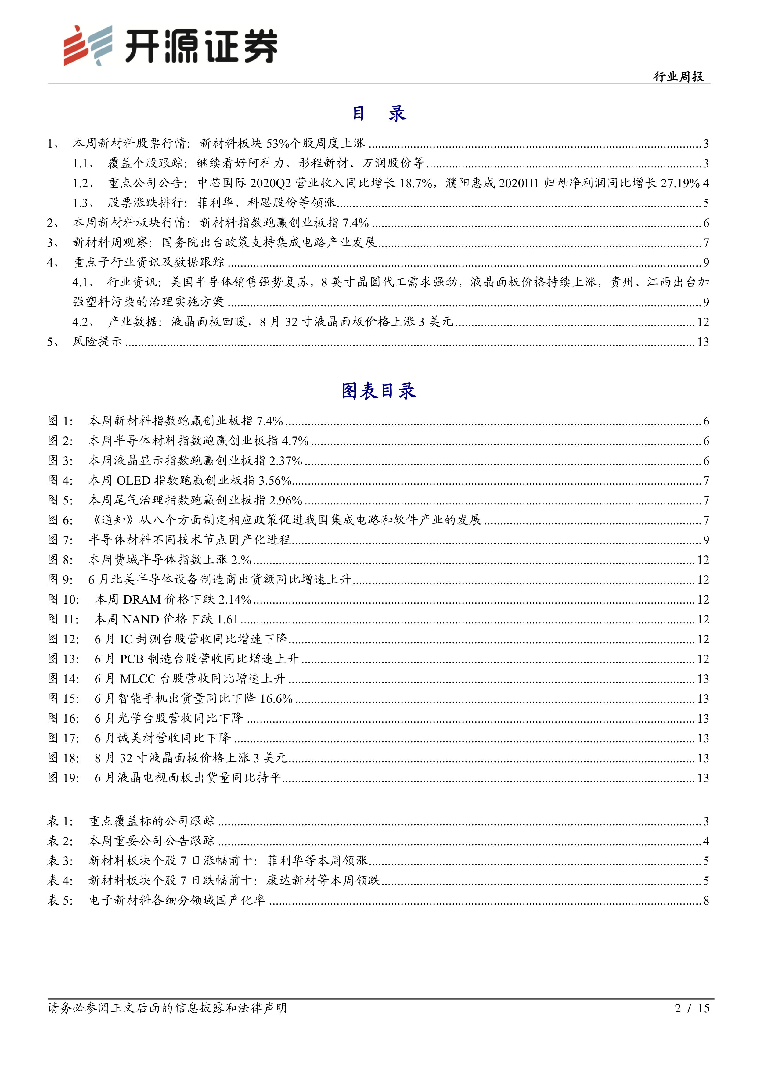 本周最重要的事件是国务院发布的促进集成电路产业发展的政策,该政策从多个方面支持集成电路产业发展,对半导体材料产业链具有重大意义。报告分析了该政策对半导体材料国产化的推动作用,并指出目前国内半导体材料国产化率不足15%,存在巨大的国产替代空间。 此外,报告还跟踪了美国半导体销售强势复苏、8英寸晶圆代工需求强劲、液晶面板价格持续上涨以及贵州、江西加强塑料污染治理等行业动态,并分析了这些动态对相关细分行业的影响。