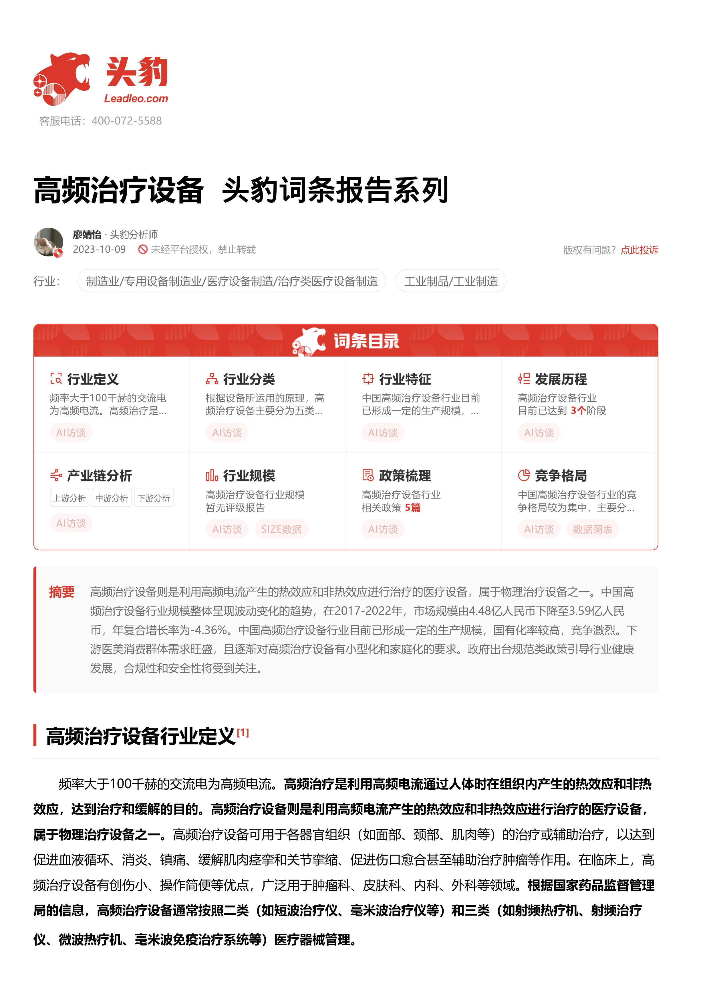 高频治疗设备 头豹词条报告系列