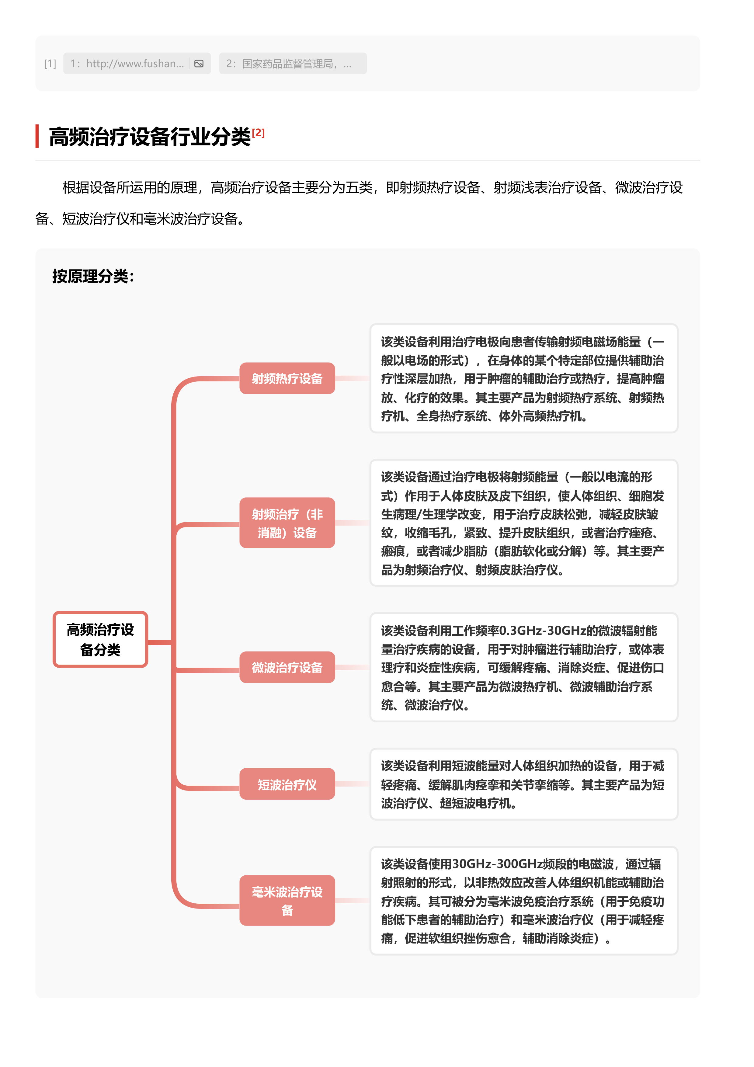 高频治疗设备利用频率大于100千赫的交流电产生的热效应和非热效应进行治疗,属于物理治疗设备。根据工作原理,主要分为射频热疗设备、射频浅表治疗设备(医美应用较多)、微波治疗设备、短波治疗仪和毫米波治疗设备五大类。