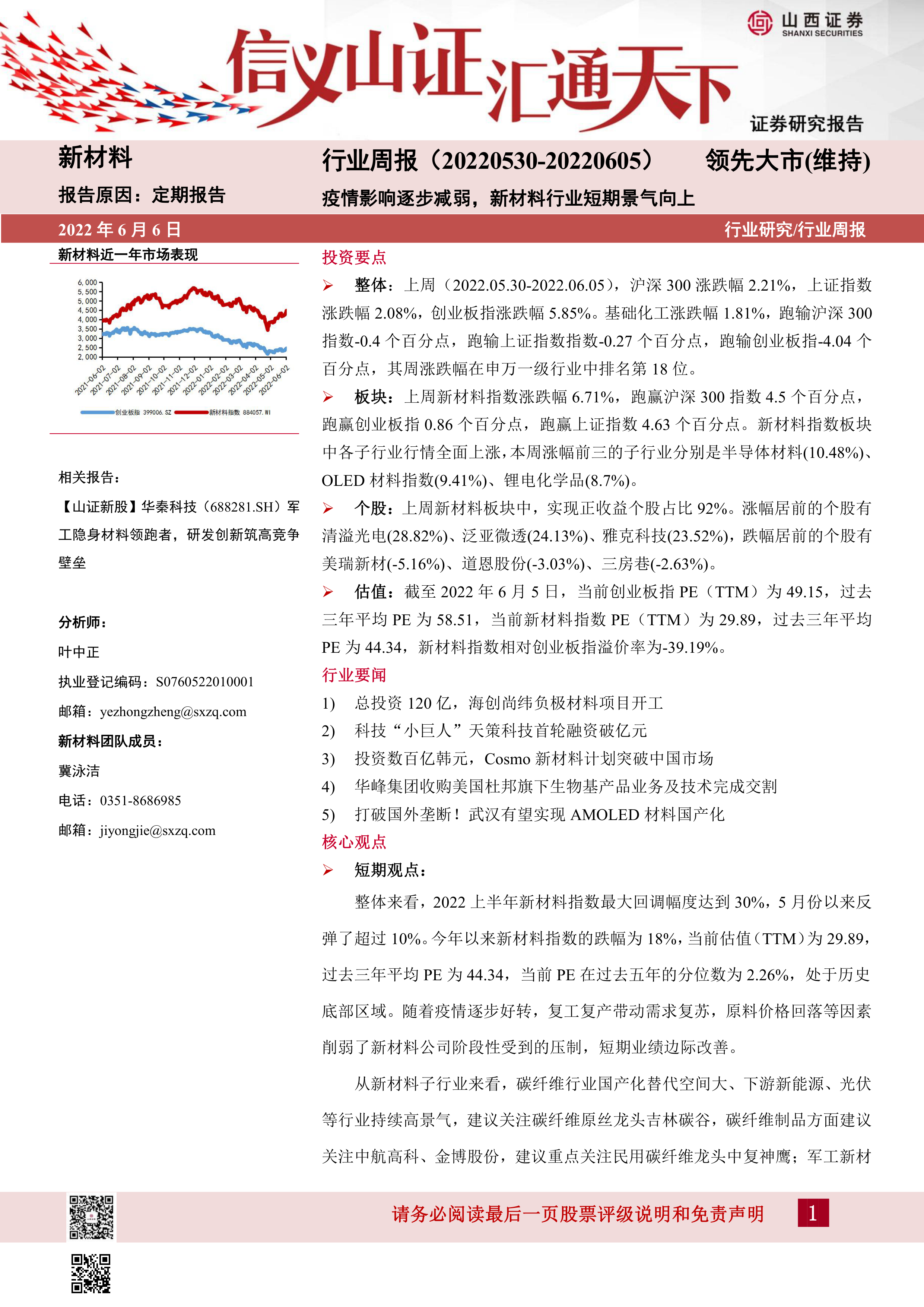 本报告对2022年5月30日至6月5日新材料行业的行情进行了回顾和分析,并对行业估值、重要新闻事件以及上市公司公告进行了总结。报告认为,尽管短期内市场存在波动,但新材料行业长期发展前景广阔,建议投资者关注相关领域的龙头企业,并密切关注行业政策和技术发展趋势。 报告同时提示了投资者需要注意的风险因素。