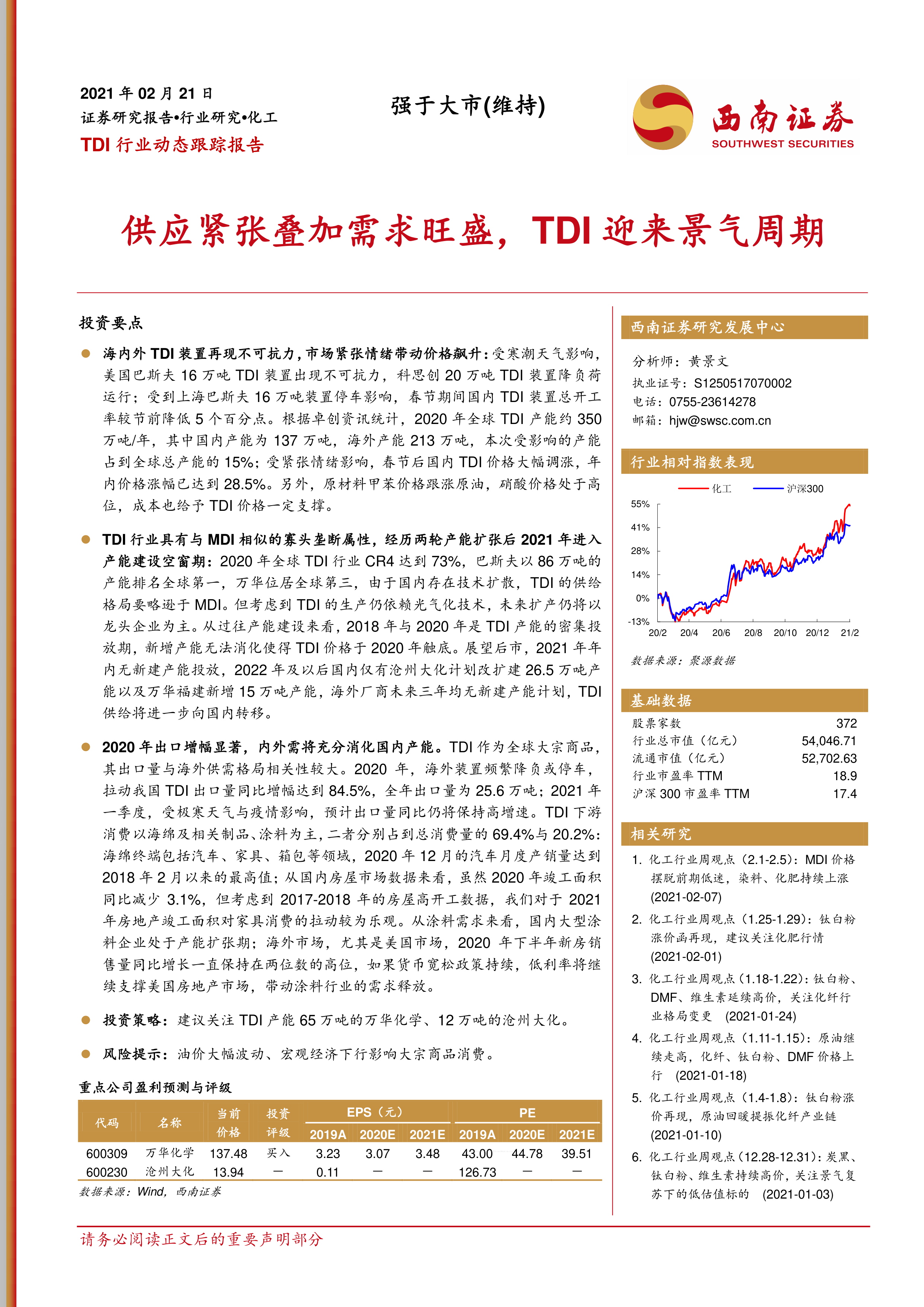 本报告的核心观点是:由于寒潮天气导致海外TDI装置减产甚至停产,叠加国内装置检修及春节期间开工率下降,造成全球TDI供应紧张,市场价格大幅上涨。同时,2021年TDI行业进入产能建设空窗期,未来产能投放有限,进一步加剧供应紧张局面。而下游需求,特别是汽车和房地产行业的复苏,将推动TDI需求增长,从而形成供需错配,利好TDI价格。因此,报告建议关注万华化学和沧州大化两家公司。