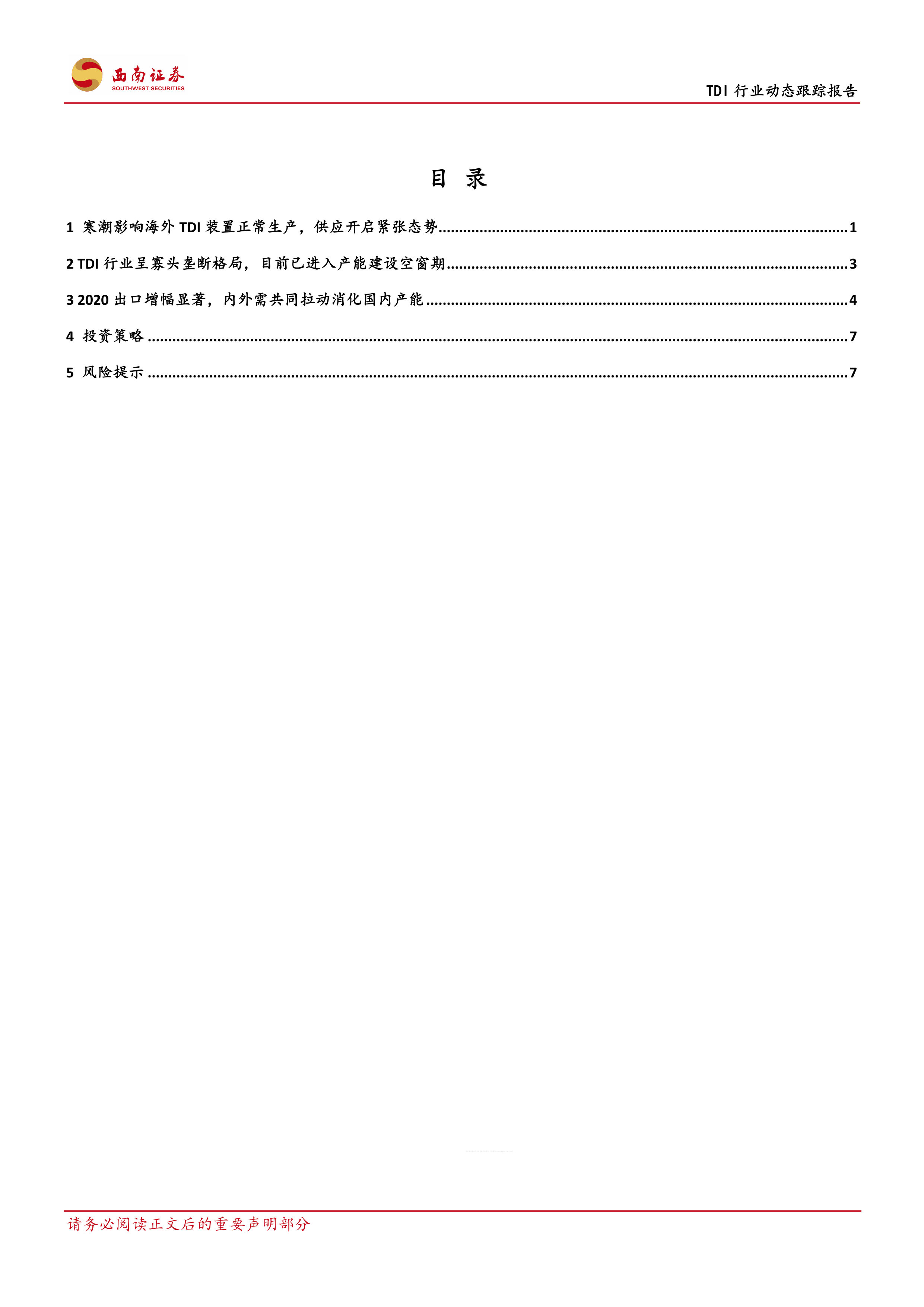本报告分析了2021年TDI行业市场现状及未来发展趋势。寒潮天气导致的供应紧张和产能建设空窗期共同推动TDI价格大幅上涨。下游需求的增长将进一步加剧供需错配,利好TDI价格。报告建议投资者关注万华化学和沧州大化两家公司,但同时也需关注油价波动和宏观经济下行风险。 报告中大量使用了图表和数据,对TDI行业的供需关系、价格走势、行业格局以及重点公司进行了深入分析,为投资者提供了较为全面的行业分析报告。