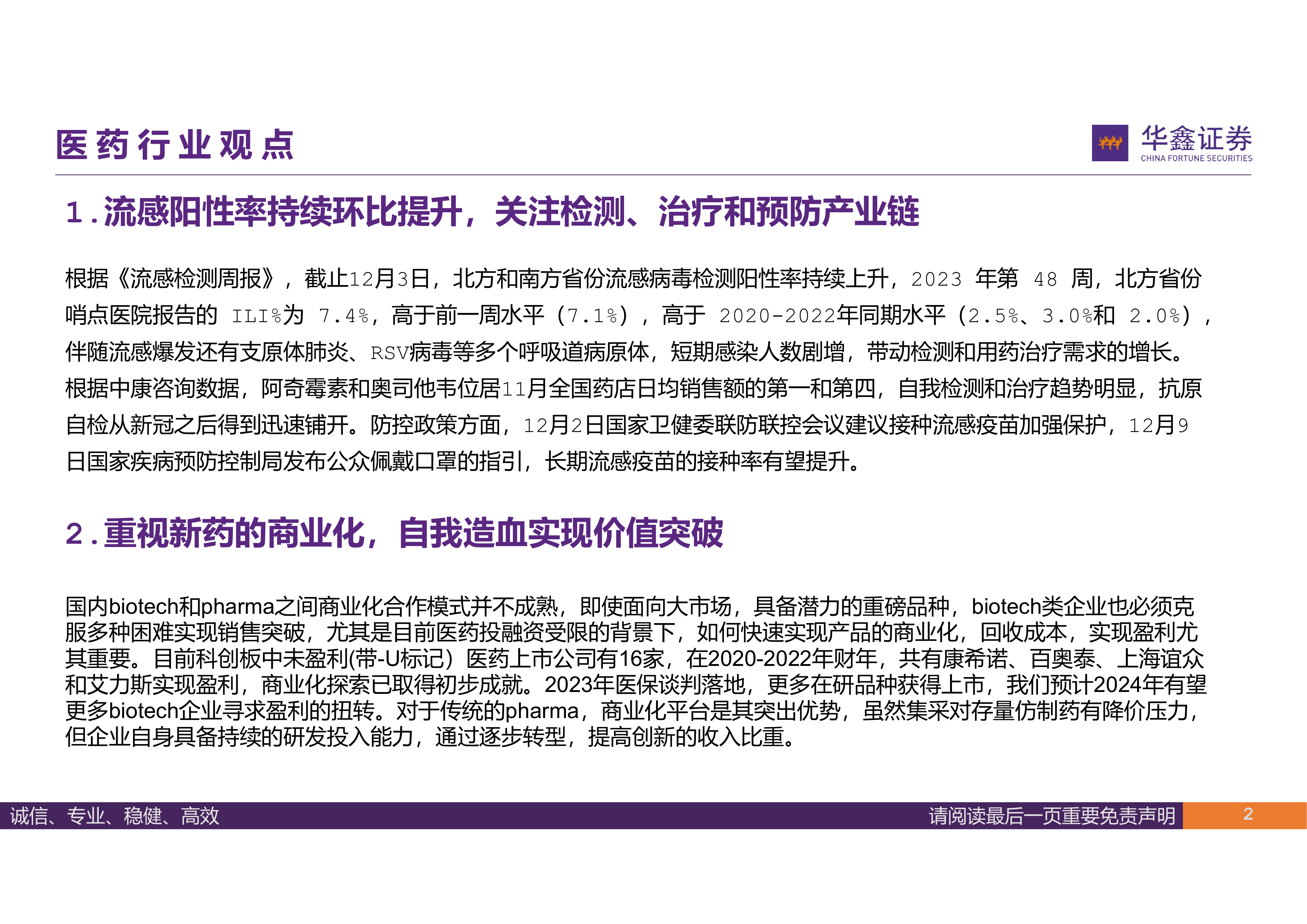 1)呼吸道疾病高发,多病原体共同流行,诊断是准确用药治疗的前提,新冠放开之后,居民自我检测治疗的意识提高,建议关注具有多联检测优势的【英诺特】,关注具有国内渠道优势的【万孚生物】。本轮流感疫情,奥司他韦治疗依然敏感,建议关注【东阳光长江药业】、【葵花药业】,新一代流感药物的需求提高,推荐【众生药业】,关注【健康元】、【济川药业】。流感疫苗接种意愿提高,2024年接种量有望继续提升,推荐【金迪克】和【华兰生物】。