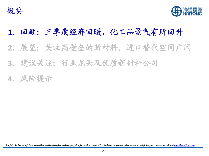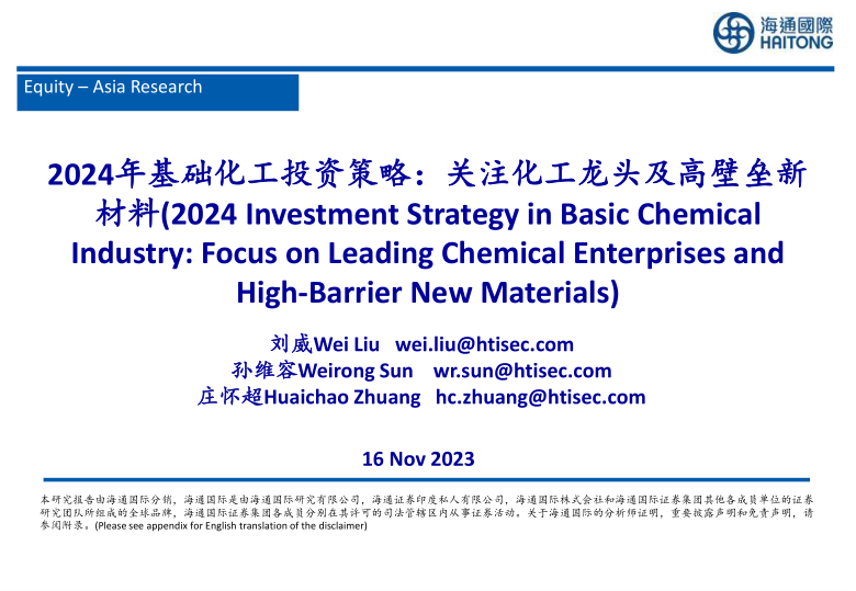 本报告的核心观点是:2024年亚洲基础化工行业投资策略应关注行业龙头企业和具有高壁垒的新材料公司。该观点基于对2023年三季度经济复苏、化工产品景气度回升以及新材料行业广阔的进口替代空间的分析。报告同时指出了原油价格波动、下游需求不及预期以及贸易摩擦加剧等潜在风险。