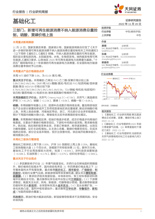 基础化工行业研究周报:三部门:新增可再生能源消费不纳入能源消费总量控制,硝酸、黄磷价格上涨