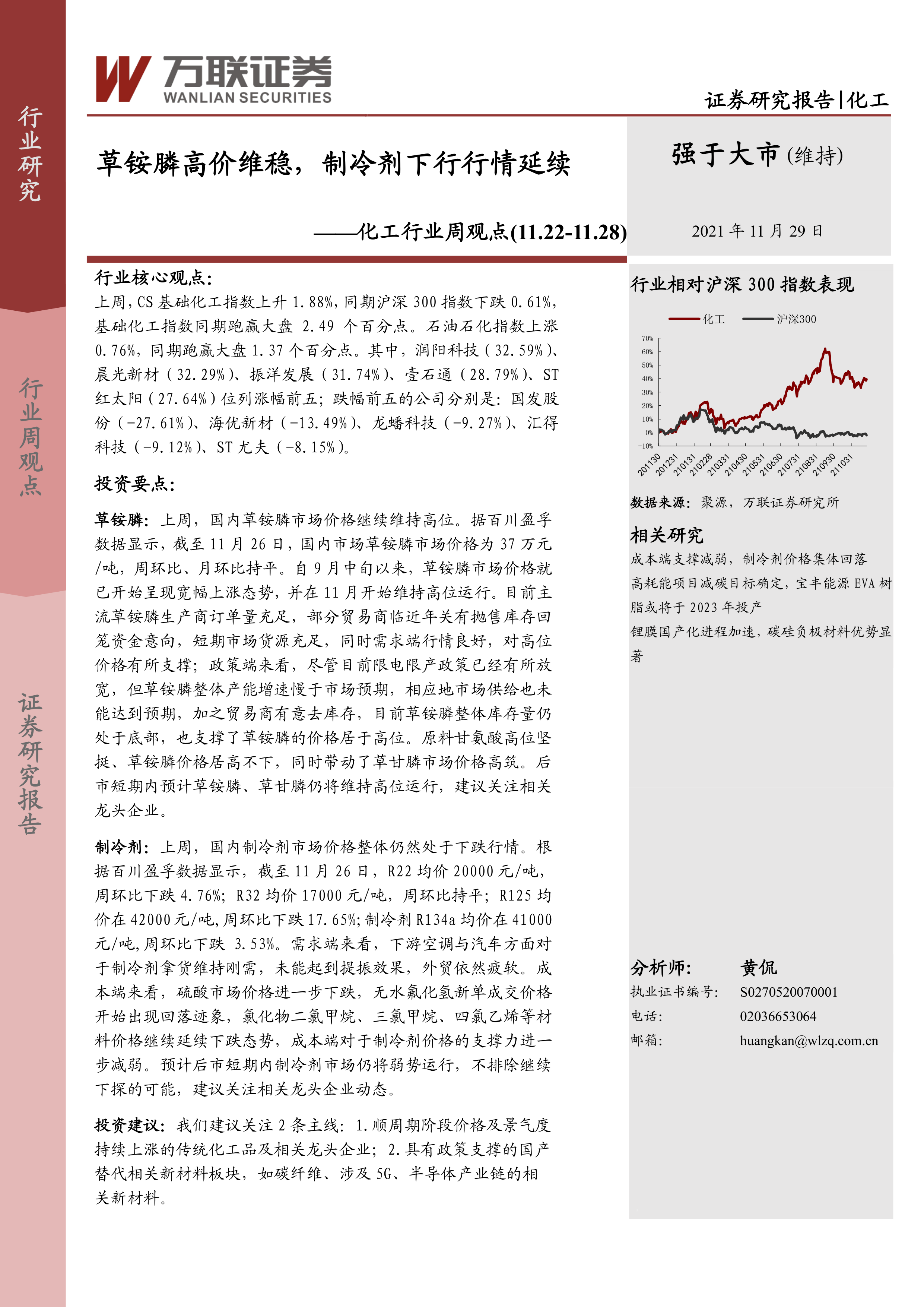 化工行业周观点:草铵膦高价维稳,制冷剂下行行情延续