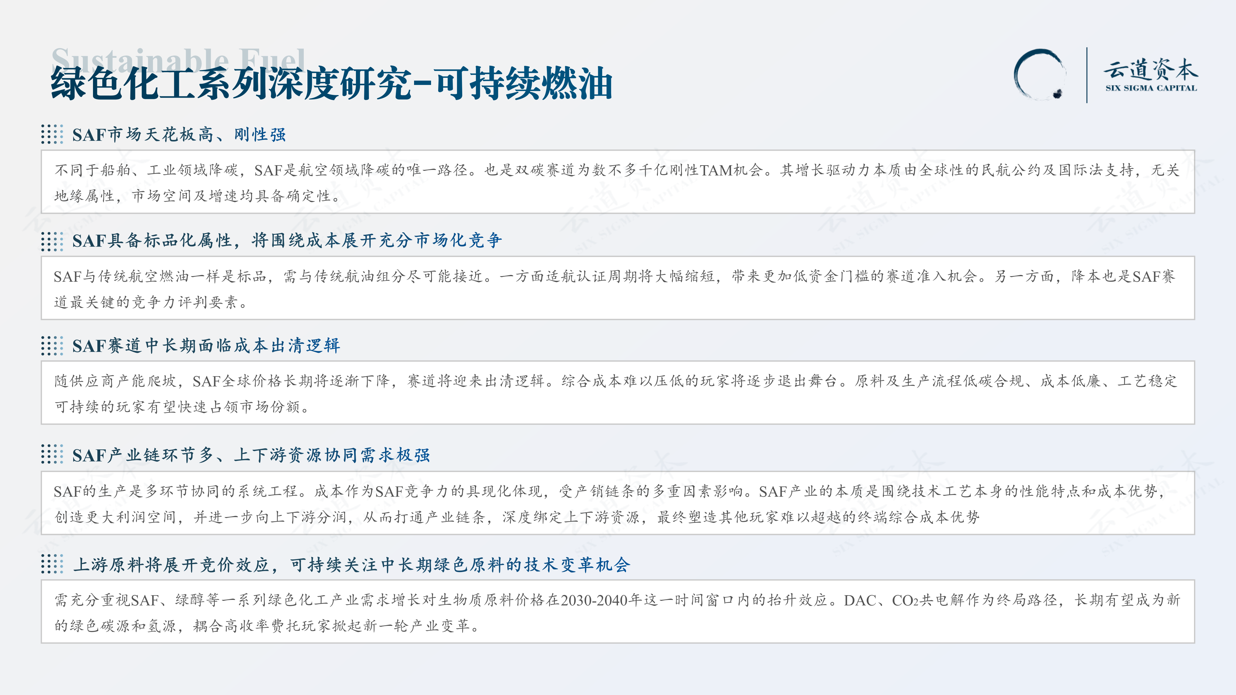 需充分重视SAF、绿醇等一系列绿色化工产业需求增长对生物质原料价格在2030-2040年这一时间窗口内的抬升效应。DAC、CO2共电解作为终局路径,长期有望成为新的绿色碳源和氢源,耦合高收率费托玩家掀起新一轮产业变革。