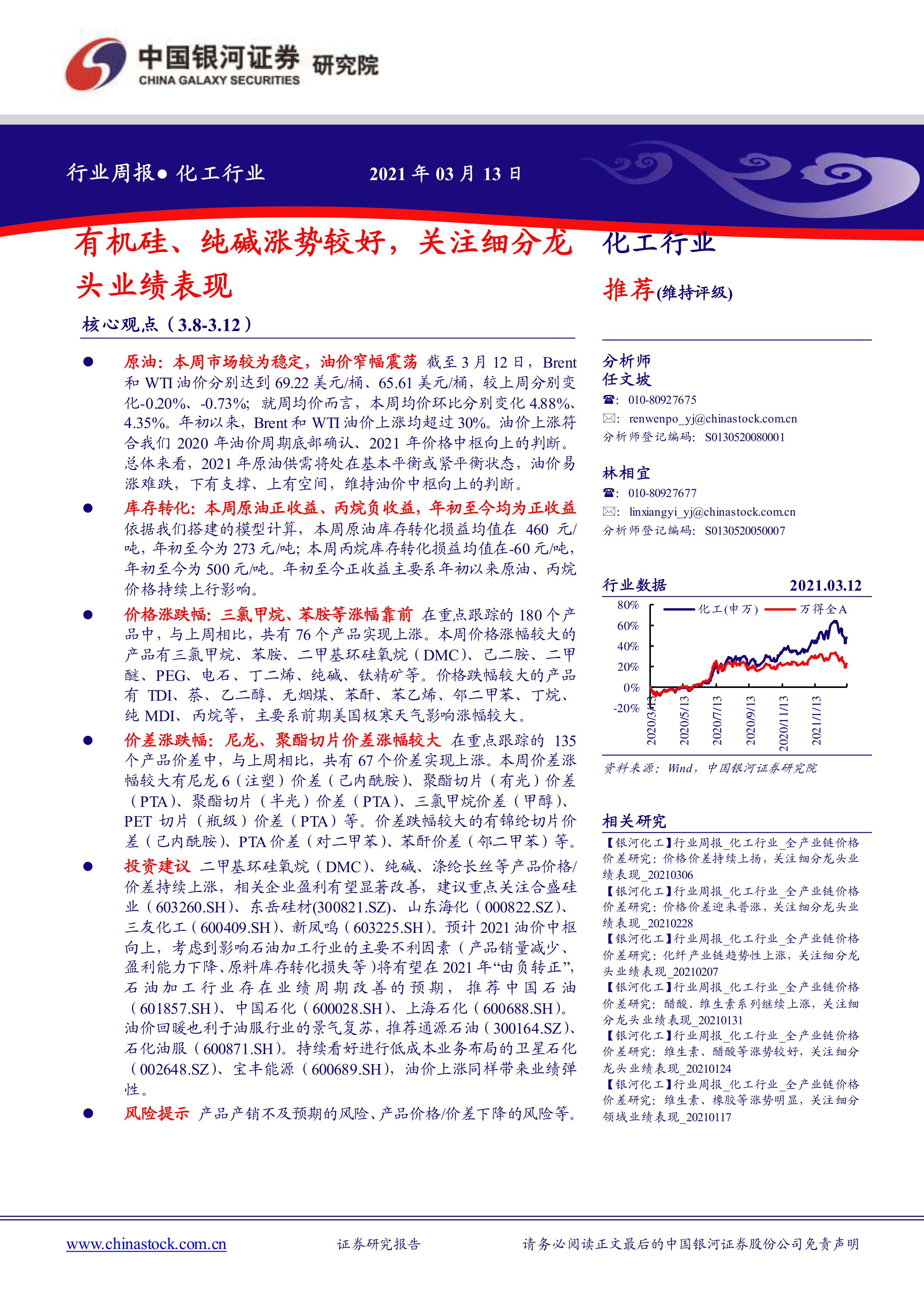 本报告的核心观点是:本周化工行业市场较为稳定,油价窄幅震荡,但部分化工产品价格和价差出现显著波动。纯碱、二甲基环硅氧烷(DMC)、涤纶长丝等产品价格和价差持续上涨,相关企业盈利有望改善;而TDI、萘、乙二醇等产品价格则出现下跌。总体来看,2021年原油供需将维持基本平衡或紧平衡状态,油价易涨难跌,利好石油加工和油服行业。报告建议关注相关细分龙头企业。