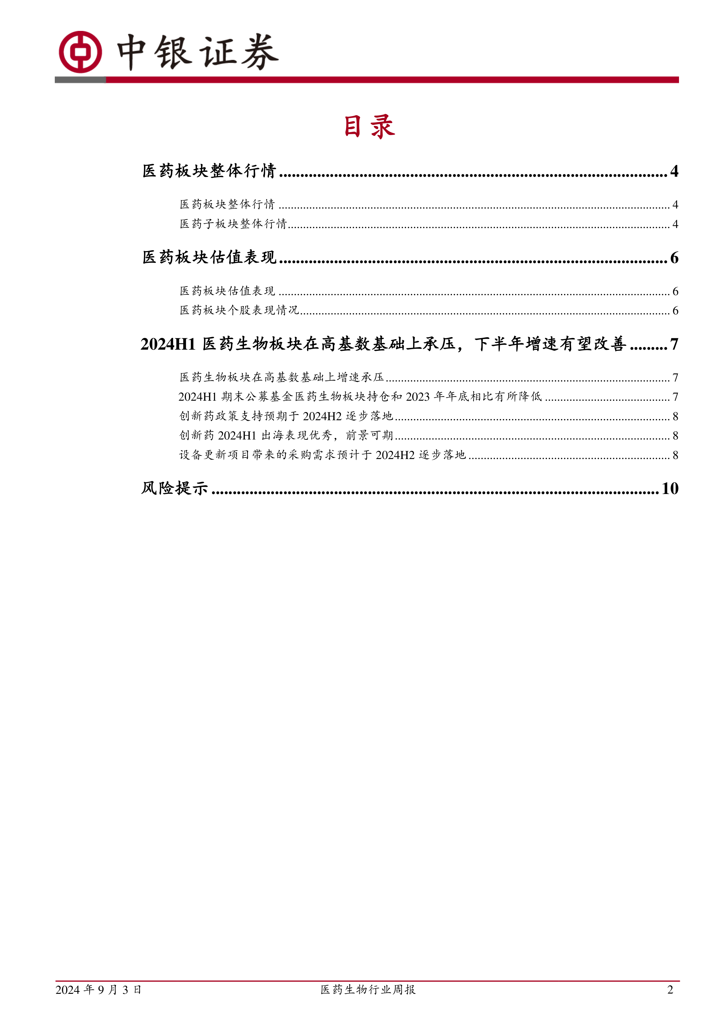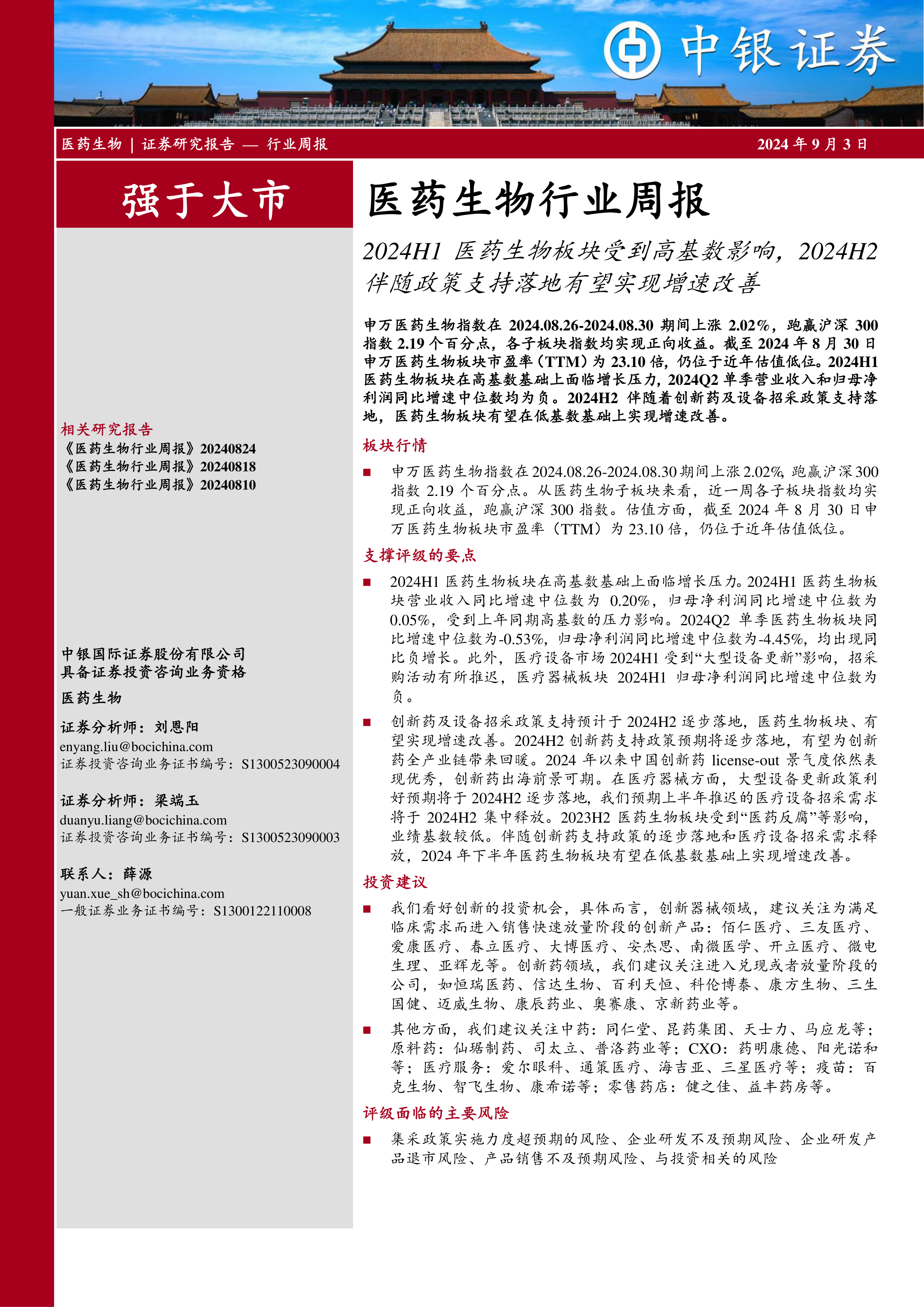 报告详细分析了申万医药各二级子板块(医疗服务、医疗器械、医药商业、生物制品、化学制药、中药)在2024年8月26日至30日期间的涨跌幅,均跑赢沪深300指数。同时,报告列出了同期涨幅前十和跌幅前十的个股,并对部分个股进行了简要分析。