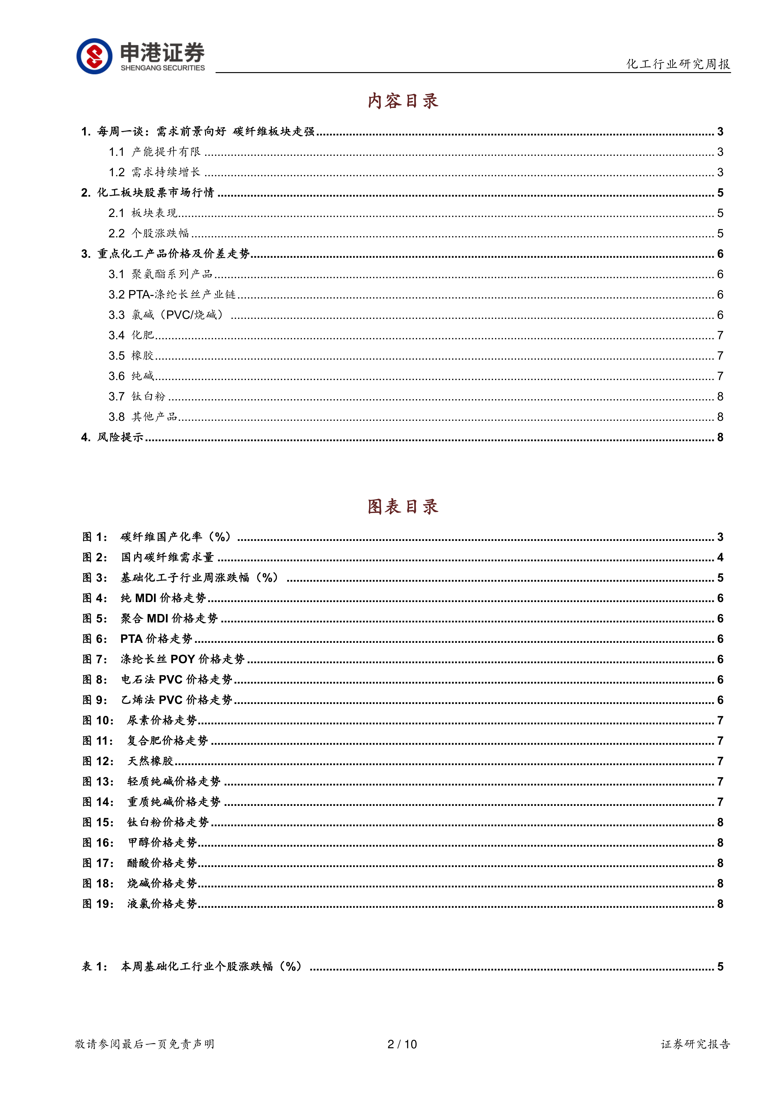 本报告基于对中国碳纤维市场供需现状的分析,认为由于国内产能提升有限,而下游需求持续增长,导致碳纤维市场供不应求的局面短期内难以改变,行业景气度有望维持。 报告建议关注中简科技、光威复材等碳纤维行业龙头企业。 报告同时提供了本周化工板块的市场表现以及重点化工产品价格走势,为投资者提供参考信息。 然而,投资者需注意报告中提到的国际油价波动、疫情反复以及贸易政策变化等风险因素。