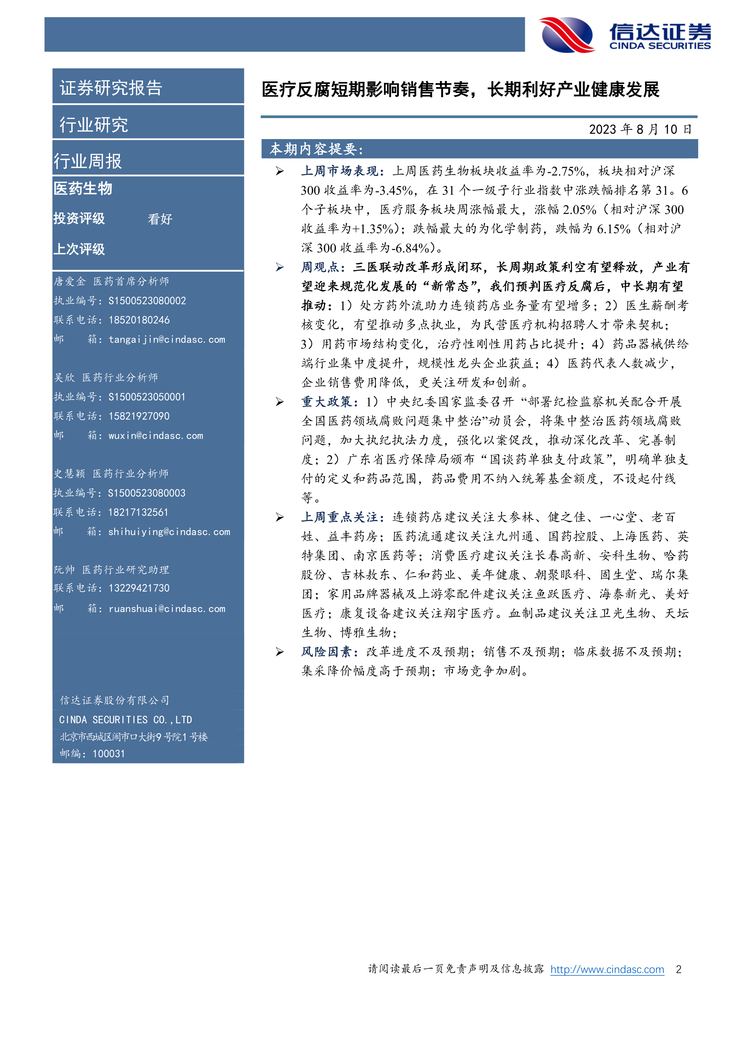 周观点:三医联动改革形成闭环,长周期政策利空有望释放,产业有望迎来规范化发展的“新常态”,我们预判医疗反腐后,中长期有望推动:1)处方药外流助力连锁药店业务量有望增多;2)医生薪酬考核变化,有望推动多点执业,为民营医疗机构招聘人才带来契机;3)用药市场结构变化,治疗性刚性用药占比提升;4)药品器械供给端行业集中度提升,规模性龙头企业获益;4)医药代表人数减少,企业销售费用降低,更关注研发和创新。