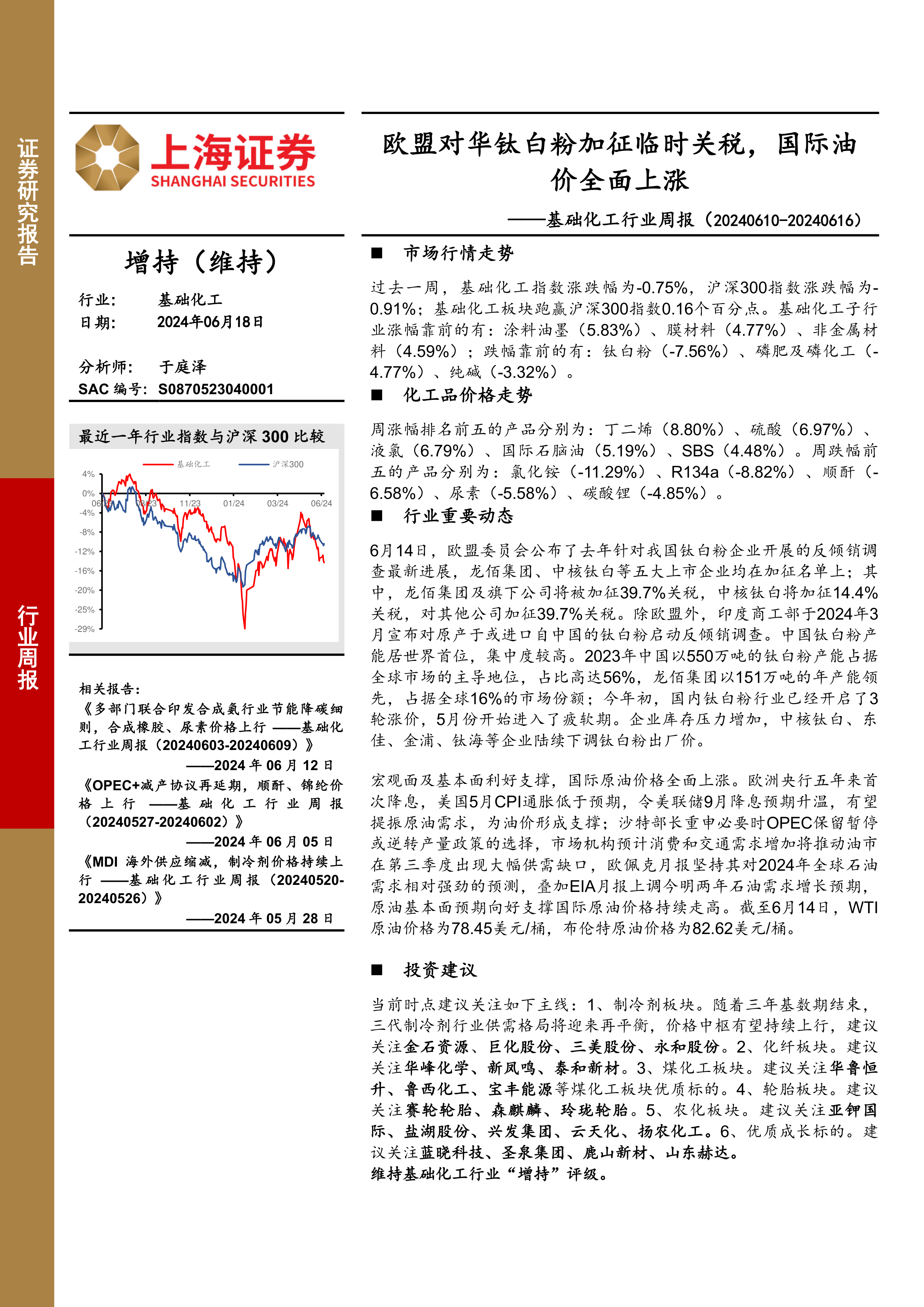 基础化工行业周报:欧盟对华钛白粉加征临时关税,国际油价全面上涨