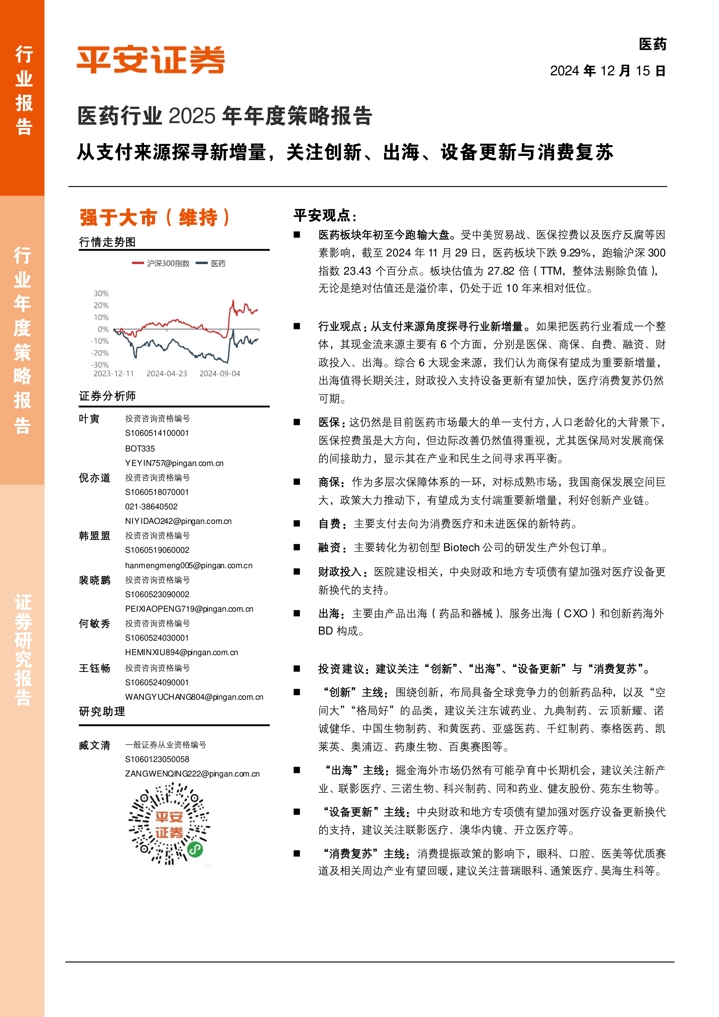 医药行业2025年年度策略报告:从支付来源探寻新增量,关注创新、出海、设备更新与消费复苏